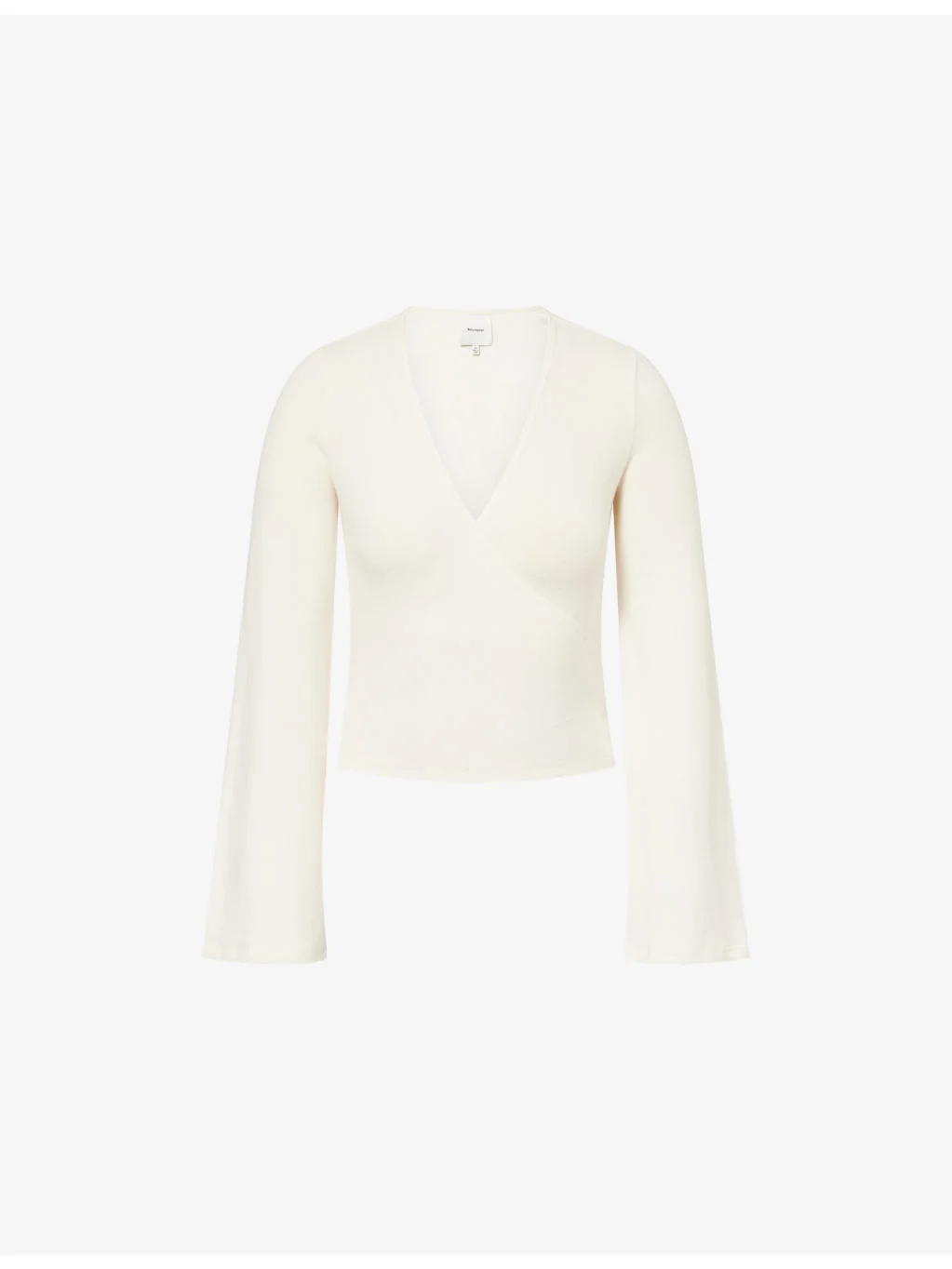 PRODUCT DETAILS - Reformation knitted top - 67% lyocell, 29% cotton, 4% elastane - Self-tie fastening at side - Regular fit, V-neck, wrap-front, long sleeves, flared cuffs, all-over knitted - Hand wash cold - Made in USA - True to size - Model is 5ft 10in/1.78m and wears a size extra small - Midweight, slight stretch Ref: R04535194