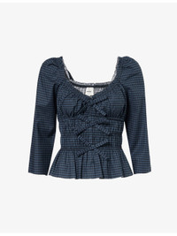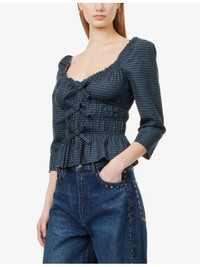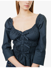 PRODUCT DETAILS - Reformation stretch-cotton top - 98% organic cotton, 2% elastane - Slips on - Slim fit, frilled V neck, long sleeves, bows embellishment at front, elasticated panels, all-over check print, ruffled hem - Machine wash at 30°C - True to size - Model is 5ft 10in/1.78m and wears a size UK 8 - Lightweight, stretchy Ref: R04433853