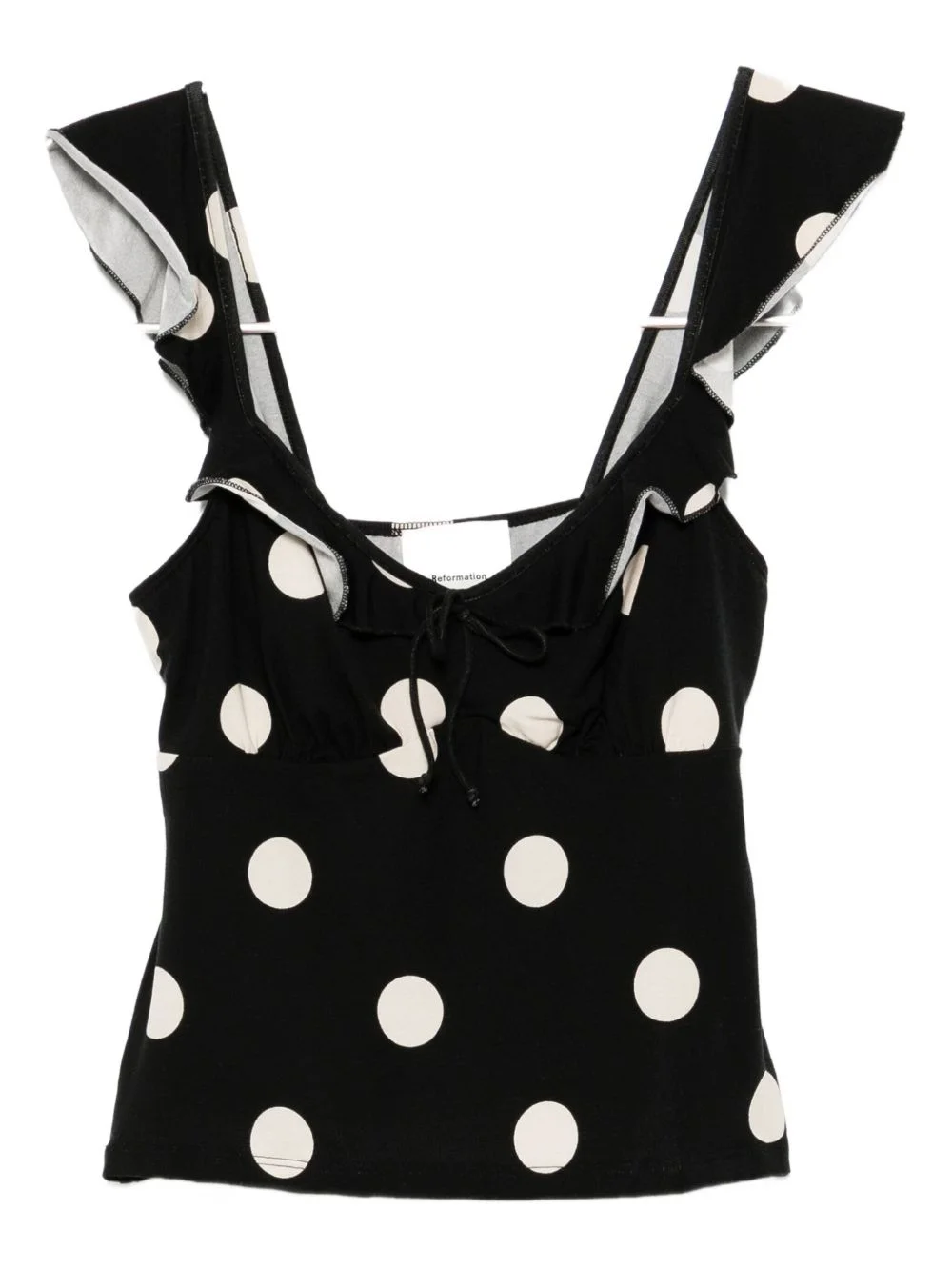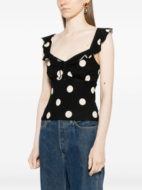 Lemmy top black ruffled detailing polka dot print Imported Composition TENCEL™ Lyocell (LENZING) 88%, Spandex/Elastane 12% SIZE & FIT Model measurements Height 5 ft 10 in(1.77 m) Bust/Chest 30.31 in(77 cm) Hips 36.22 in(92 cm) Waist 24.8 in(63 cm) FittingInformation Designed for a slim fit that sits just away from the body offering a close yet comfortable fit Made from a midweight stretch fabric, this piece offers elasticity and flexibility when worn Washing instructions Machine Wash