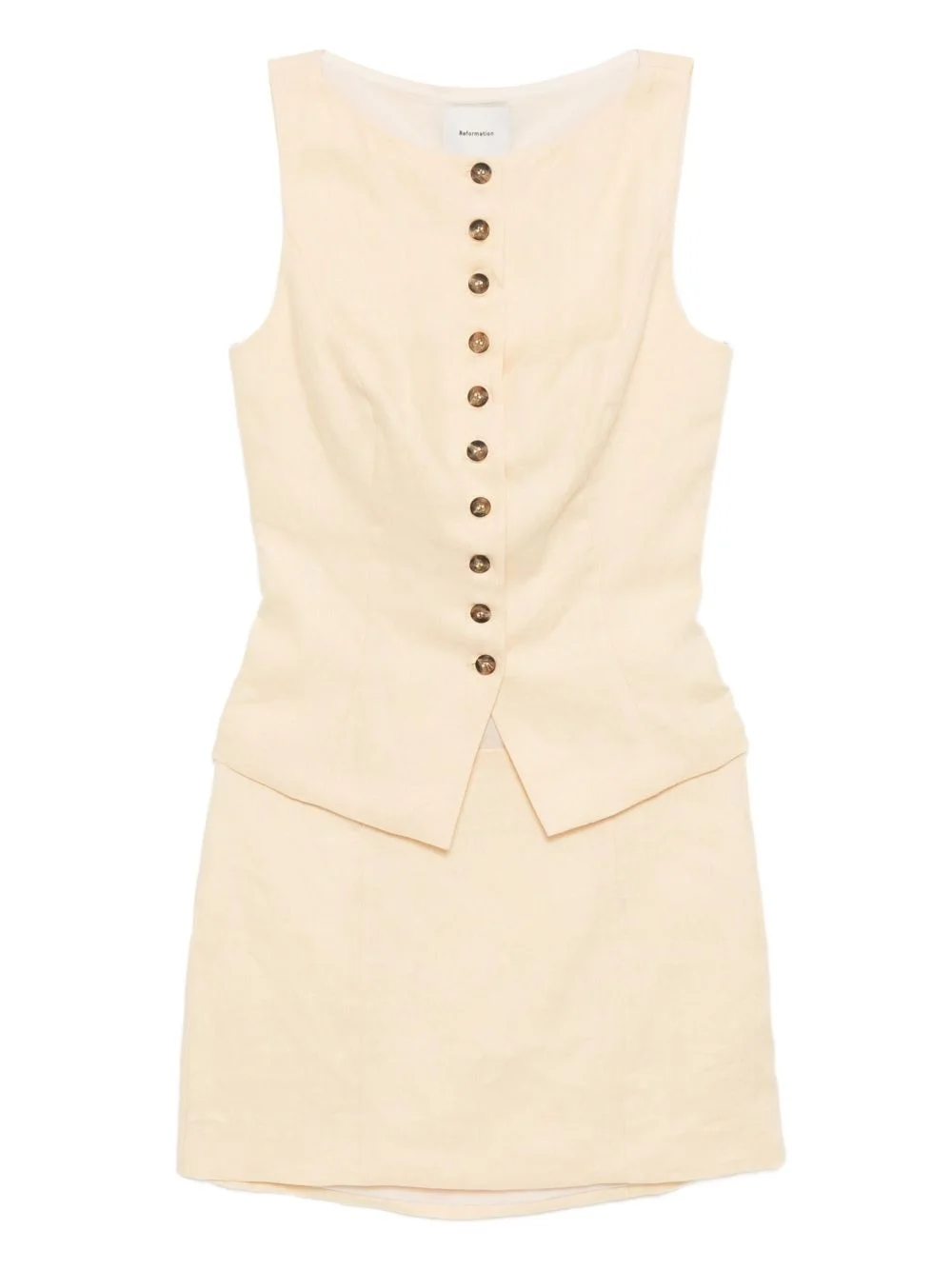 Lina linen two piece Highlights - Top - Light yellow - Front button fastening - Rear tie fastening - Boat neck - Sleeveless - Bottom - Light yellow - Side zip fastening - Straight hem Made in United States Composition Linen/Flax 100% SIZE & FIT Model measurements Height 5 ft 10 in(1.78 m) Bust/Chest 31.88 in(81 cm) Hips 37 in(94 cm) Waist 25.19 in(64 cm) FittingInformation This mini-length skirt is intended to be worn just below the waist Made from a midweight non-stretch fabric Washing instructions Machine Wash