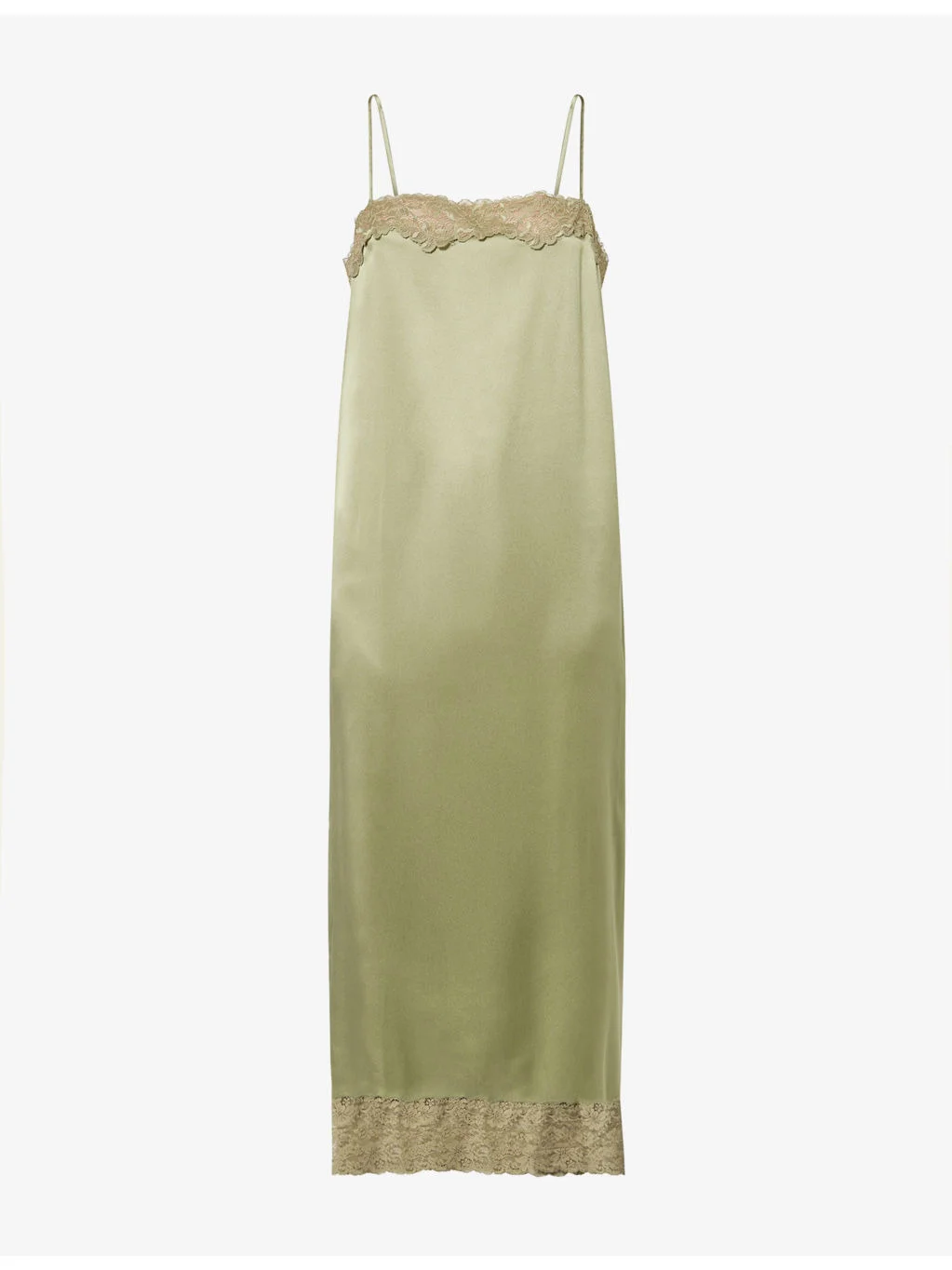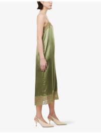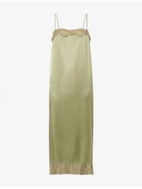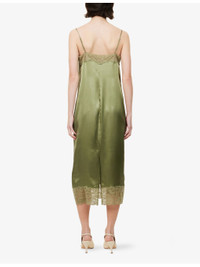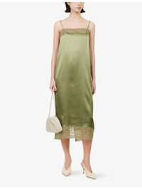 PRODUCT DETAILS - Reformation silk midi dress - 100% silk; contrast 83% fabric, 17% elastane - Relaxed fit, straight neckline, adjustable shoulder straps, floral lace trims, central rear slit, midi length, silk charmeuse fabric - Dry clean - Made in USA - True to size - Size small: length 47in / 120cm - Model is 5ft 10in/1.78m and wears a size small - Lightweight, non-stretch Ref: R04598614