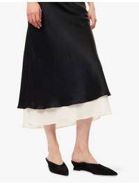 PRODUCT DETAILS - Reformation silk midi skirt - 100% silk; lining 100% viscose - Regular fit, mid-rise, elasticated waistband, flared hem, exposed lining - Machine wash cold - True to size - Size small: length 39in / 99cm - Model is 5ft 10in/1.78m and wears a size small - Lightweight, non-stretch Ref: R04535199