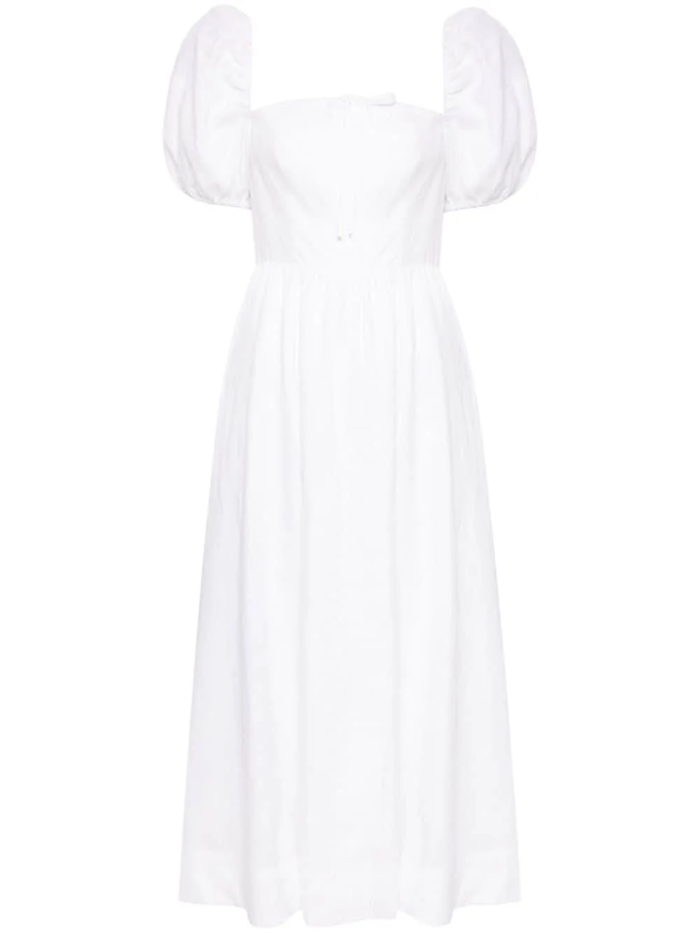 Marella linen midi dress Highlights - White - Linen/flax - Lace trim - Bow detailing - Smocked panel - Square neck - Short puff sleeves - A-line skirt - Straight hem - Organic-cotton lining - Mid-length Imported Composition Lining: Organic Cotton 100% Outer: Linen/Flax 100% SIZE & FIT Model measurements Height 5 ft 10 in(1.78 m) Bust/Chest 32.67 in(83 cm) Hips 37 in(94 cm) Waist 25.59 in(65 cm) FittingInformation Designed for a close fit at the chest with a loose fit over the waist and hips Made from a midweight non-stretch fabric This piece fits true to size – take your usual size