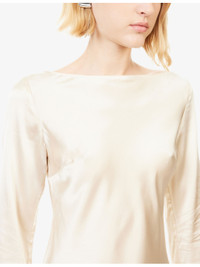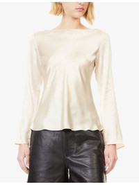 PRODUCT DETAILS - Reformation silk top - 100% silk - Regular fit, boat-neck, long bell sleeves, unlined - Dry clean - True to size - Model is 5ft 10in/1.78m and wears a size UK 8 - Lightweight, non-stretch Ref: R04546896