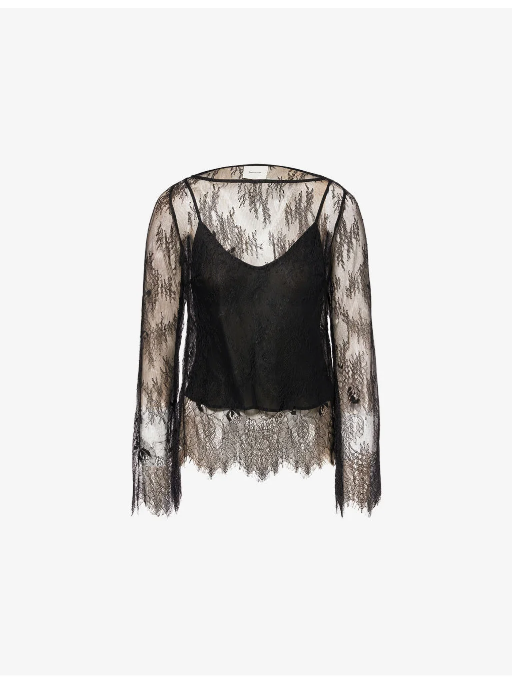 PRODUCT DETAILS - Reformation lace top - 100% nylon; lining 100% viscose - Cropped fit, round neck, long sleeves, all-over sheer lace fabric, spaghetti-strap vest top lining - Dry clean - Made in USA - True to size - Model is 5ft 10in/1.78m and wears a size UK 8 - Lightweight, slight stretch Ref: R04559811