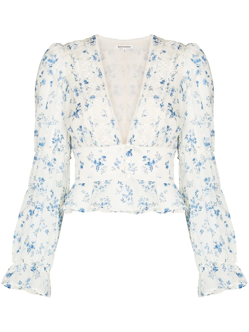 Meadowlark V-neck cropped blouse Reformation's AW21 collection uses some of the brand's most iconic silhouettes and motifs and blends them with autumnal textures and colourways. Sustainably made from organic cotton, the Meadowlark blouse is embellished with detailed flowers and lace inserts for a casual and lighthearted look that contrasts with its sharp plunging V-shaped neckline. It's cut for a cropped fit and finished with a flared ruffled hem. Imported Composition Lining: Organic Cotton 100% Outer: Organic Cotton 100% Washing instructions Hand Wash
