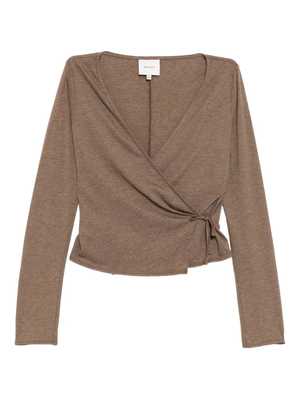 Perrin top Highlights - Coffee brown - Wrap design - Front tie fastening Made in United States Composition Organic Cotton 60%, Lyocell 40% SIZE & FIT Model measurements Height 5 ft 10 in(1.77 m) Bust/Chest 30.31 in(77 cm) Hips 36.22 in(92 cm) Waist 24.8 in(63 cm) FittingInformation Designed for a wraparound style that can be adjusted to your preference The tie fastening gives an adaptable and personalised fit Made from a midweight stretch fabric, this piece offers elasticity and flexibility when worn Washing instructions Machine Wash