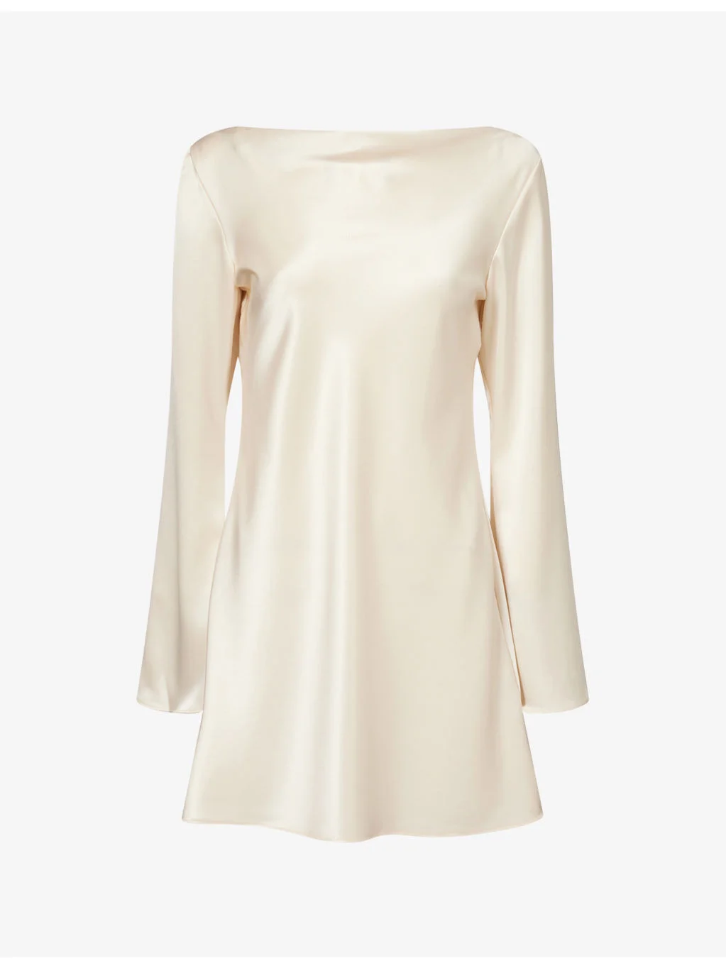 PRODUCT DETAILS - Reformation satin mini dress - 88% acetate, 12% polyester - Regular fit, boat neck, long bell sleeves, mini dress, unlined - Machine wash cold - Made in Mexico - True to size - Size small: length 32in / 81.2cm - Model is 5ft 10in/1.78m and wears a size small - Lightweight, non-stretch Ref: R04559800
