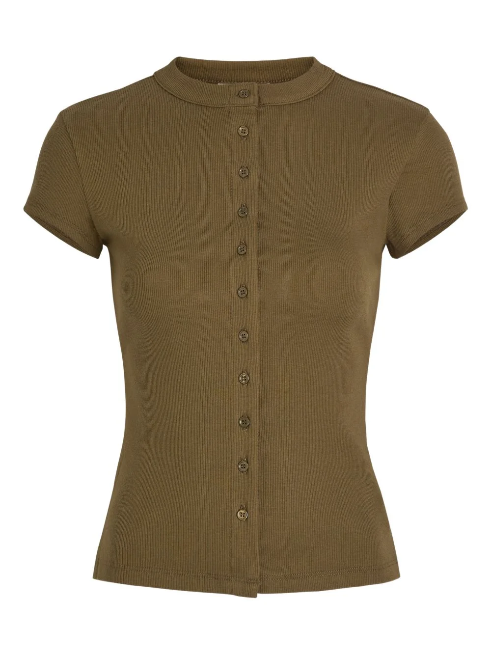 Raelynn buttoned ribbed top Highlights - Olive green - Ribbed knit - Button fastening - Round neck - Short sleeves Imported Composition Organic Cotton 97%, Spandex/Elastane 3% Washing instructions Read Manufacturer Guidelines