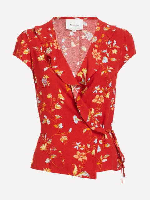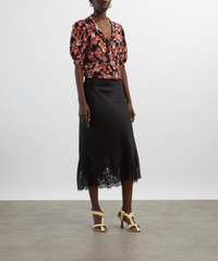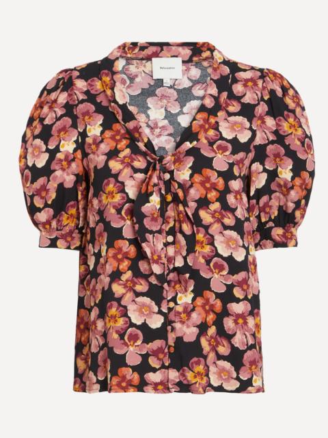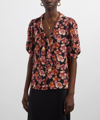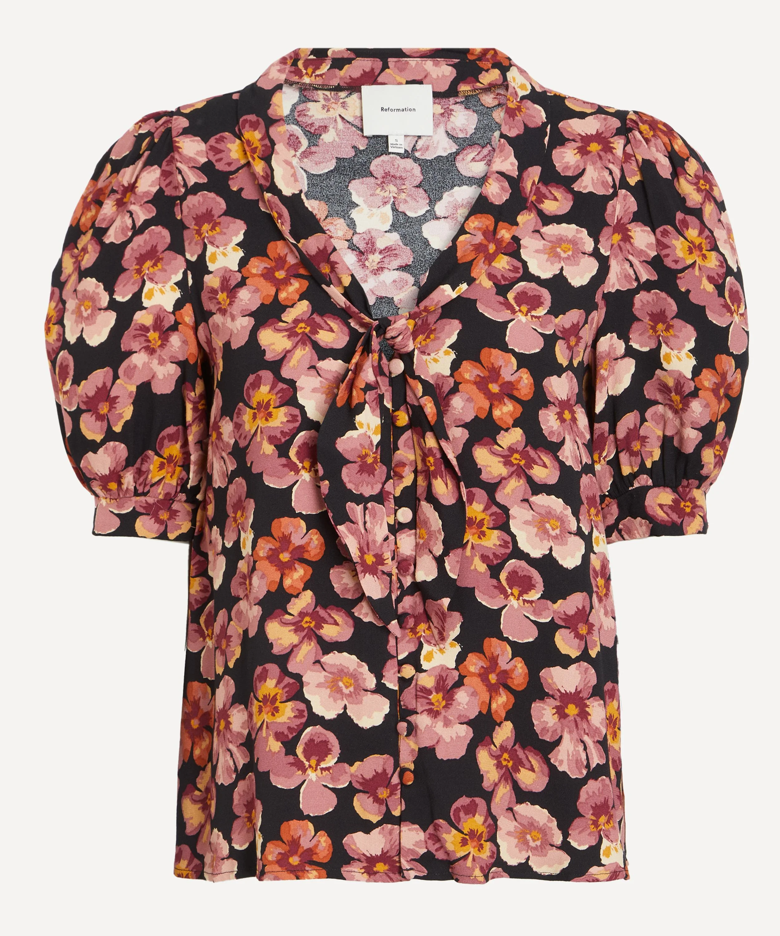 DETAILS Crepe top Pansy print Relaxed fit Short puff sleeves Pussy-bow neckline Front button fastening Fabric-covered buttons SIZE & FIT Model is 175cm/5'9"; Chest 75cm; Waist: 23.5cm; Hip: 33.5cm and wears a size S COMPOSITION & CARE 100% Viscose Dry clean