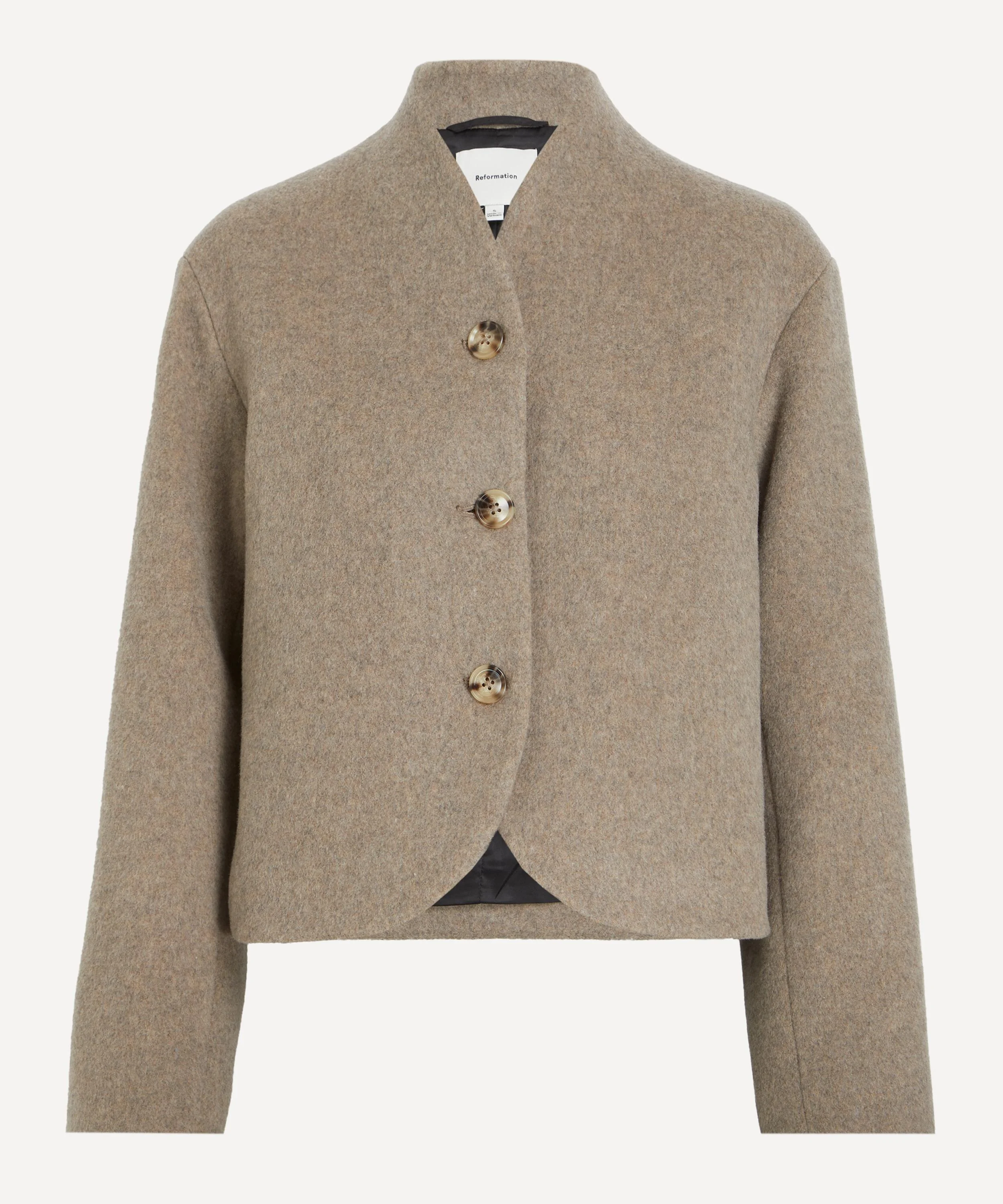 DETAILS Heavy-weight wool-blend jacket Oversized fit Dropped shoulders Long sleeves Swan neckline Front button fastening SIZE & FIT Model is 175cm/5'9"; Chest 75cm; Waist: 23.5cm; Hip: 33.5cm and wears a size S COMPOSITION & CARE 70% MWool®; 30% Polyamide Dry clean