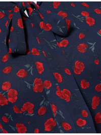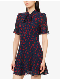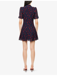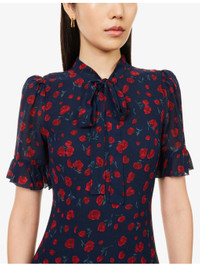 PRODUCT DETAILS - Reformation x Nara Smith woven mini dress - 100% viscose - Concealed zip fastening at back - Slim fit, self-tie fastening V-neck, puffed short sleeves, ruffled cuffs, all-over rose print, all-over crepe texture, fully lined, flared hem - Dry clean - True to size - Size UK 4: length 32in / 83cm - Model is 5ft 10in/1.78m and wears a size UK 4 - Lightweight, stretchy Ref: R04531310