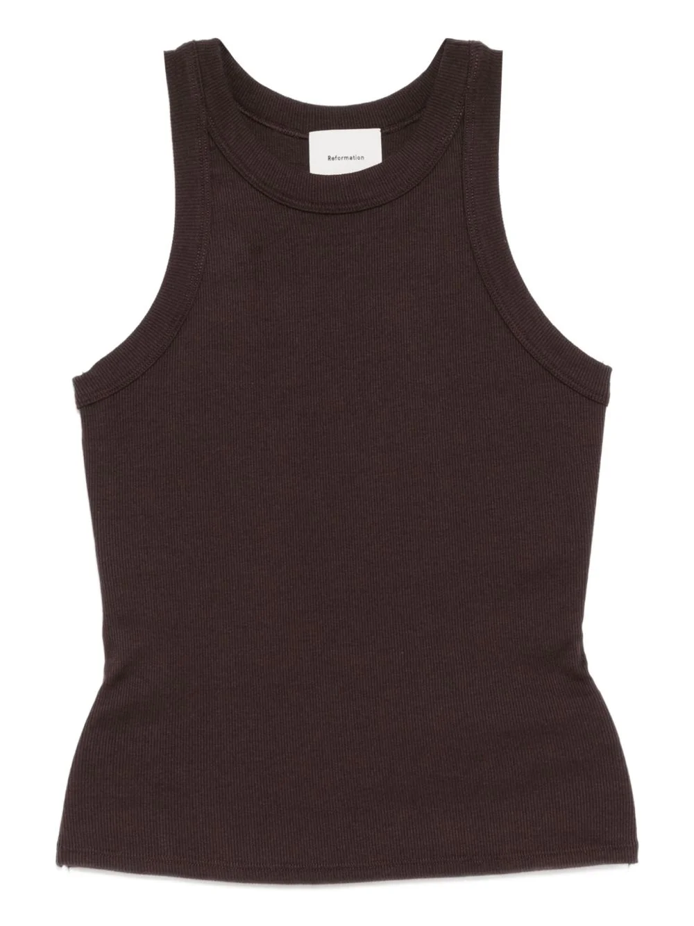Tasha tank top Highlights - Coffee brown - Crew neck - Sleeveless - Ribbed knit Made in United States Composition Organic Cotton 97%, Spandex/Elastane 3% SIZE & FIT Model measurements Height 5 ft 10 in(1.77 m) Bust/Chest 30.31 in(77 cm) Hips 36.22 in(92 cm) Waist 24.8 in(63 cm) FittingInformation Designed for a close fit throughout Made from a midweight stretch fabric, this piece offers elasticity and flexibility when worn Washing instructions Machine Wash