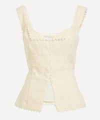 DETAILS Linen top Fitted throughout Sweetheart neckline with winged flaps Buttoned placket Waist ties at the back Lace trims SIZE & FIT Model is 180cm/5'11"; Chest: 81cm; Waist: 61cm; Hip: 88cm and wears a size 8 COMPOSITION & CARE 100% Linen Wash cold, dry flat