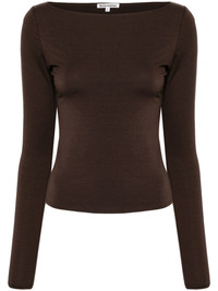 Wiley boat-neck top Highlights - Cedar brown - Tencel™ lyocell blend - Lightweight jersey - Boat neck - Long sleeves Made in United States Composition TENCEL™ Lyocell (LENZING) 88%, Spandex/Elastane 12% SIZE & FIT Model measurements Height 5 ft 10 in(1.78 m) Bust/Chest 32.67 in(83 cm) Hips 37 in(94 cm) Waist 25.59 in(65 cm) FittingInformation Designed for a close fit throughout Made from a lightweight stretch fabric, this piece offers elasticity and flexibility when worn This piece fits true to size – take your usual size