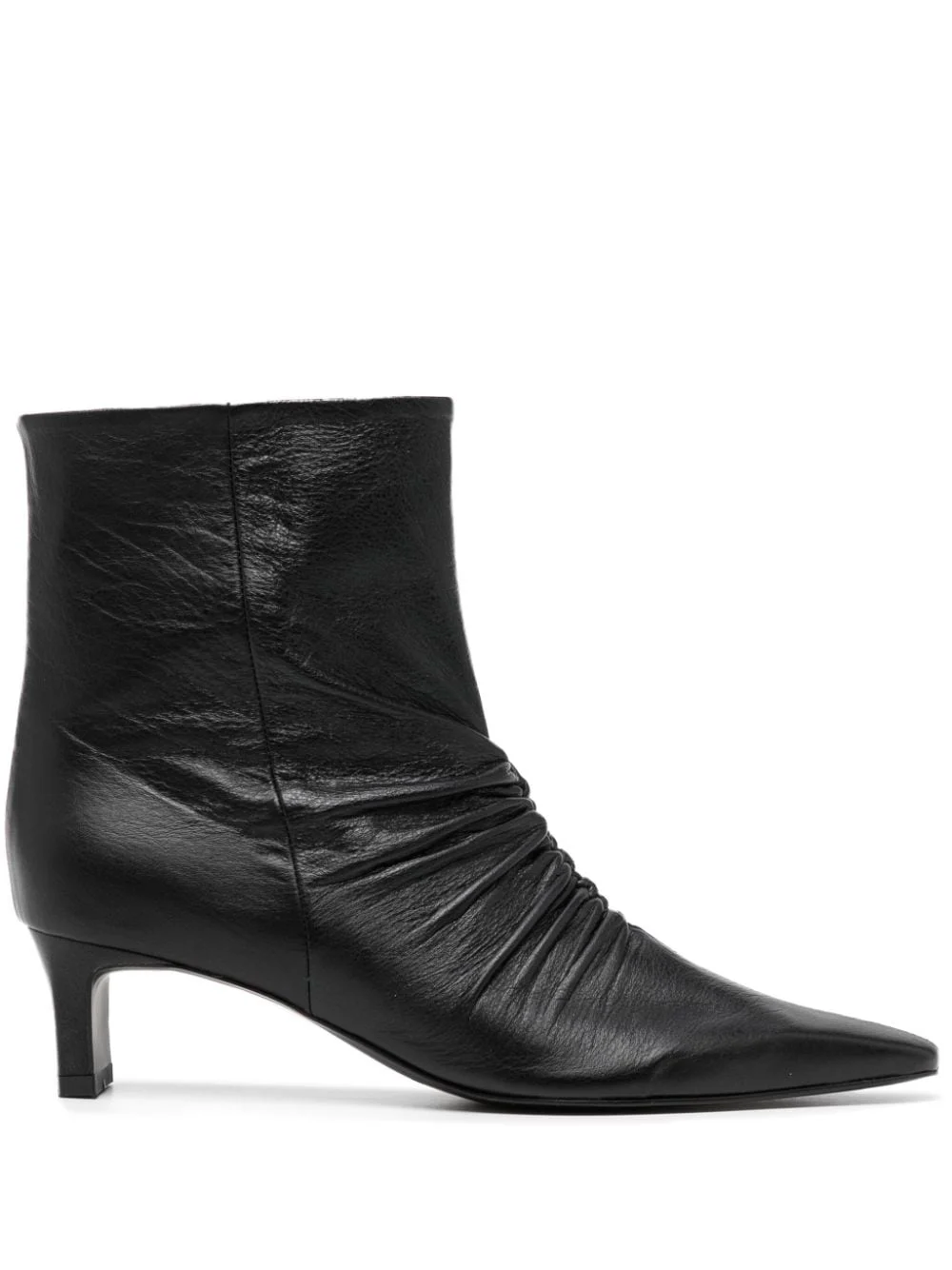 Rushy 50mm leather boots Highlights - Black - Calf leather - Draped detailing - Pointed toe - Branded leather insole - Ankle-length - 50mm mid block heel Imported Composition Leather 100% SIZE & FIT Measurement CIRCUMFERENCE 4.72 in(12 cm) HEEL 1.96 in(5 cm) HEIGHT 7.87 in(20 cm)