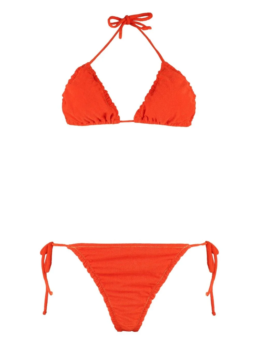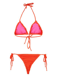 Concetta frilled bikini set Highlights - Bright orange - Frilled trim - Adjustable ties - Contrasting lining - Side tie bottoms - Be mindful to try on swimwear over your own garments. Made in Italy Composition Polyamide 85%, Elastane 15%
