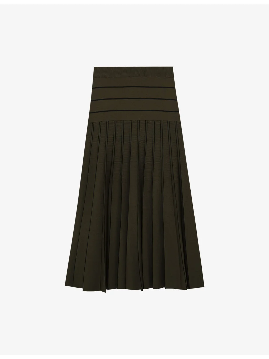 PRODUCT DETAILS - Reiss knitted midi skirt - 52% viscose, 46% nylon, 2% elastane - Regular fit, mid-rise, pleated design, stripe pattern - Hand wash - True to size - Model is 5ft 10in/1.78m and wears a size small - Lightweight, stretchy Ref: R04522308