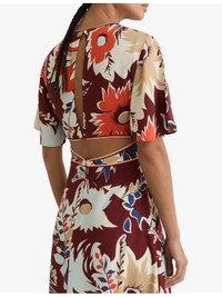 PRODUCT DETAILS - Reiss woven midi dress - 100% viscose - Concealed zip fastening at back - Cinched waist, v-neck, short flounce sleeves, twisted cut-out at waistband, piped trims, all-over floral print, button-fastened keyhole at back - Machine wash at 30°C - True to size - Model is 5ft 10in/1.78m and wears a size UK 8 - Midweight, non-stretch Ref: R04534164