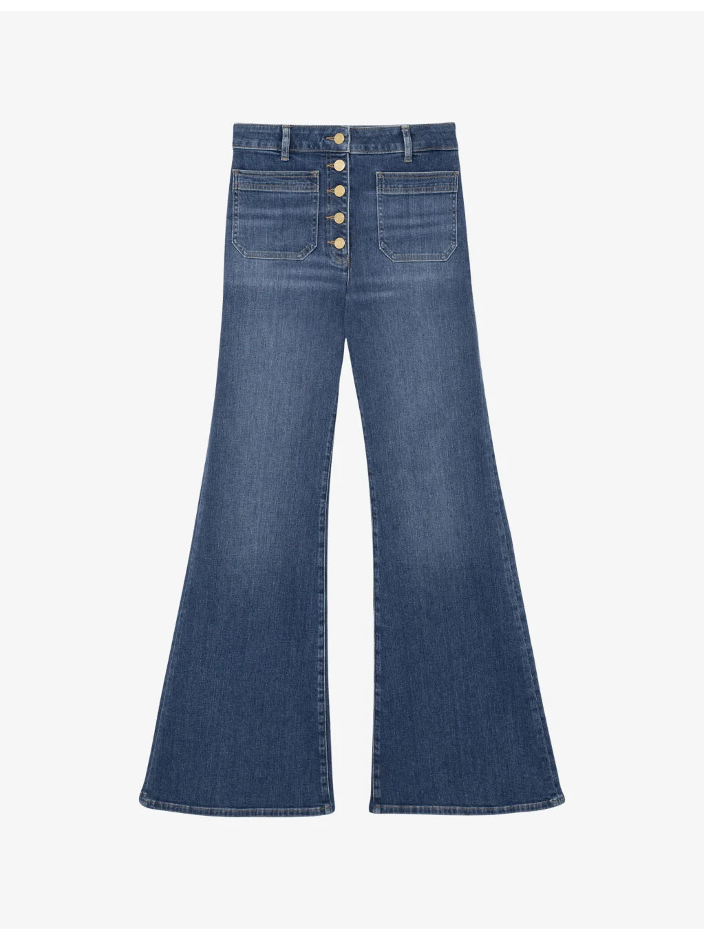 PRODUCT DETAILS - Reiss stretch-cotton jeans - 95% cotton, 5% elastane - Button fastening - Regular fit, high-rise, flared leg, belt loops, side pockets, back pockets, whiskering - Machine wash mild - True to size - Model is 5ft 9in/1.75m and wears a size 26 - Midweight, slight stretch Ref: R04585781