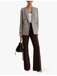 PRODUCT DETAILS - Reiss wool and cotton-blend blazer - 56% wool, 44% cotton - Exposed button fastening at front - Slim fit, peak lapels, welt pocket at chest, long sleeves, two pockets at side, herringbone design, double breasted - Dry clean - True to size - Model is 5ft 9in/1.75m and wears a size UK 8 - Midweight, non-stretch Ref: R04519973