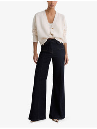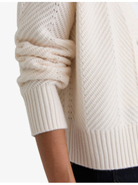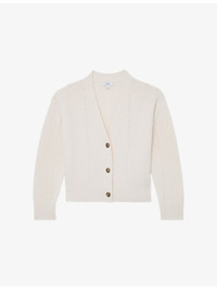 PRODUCT DETAILS - Reiss wool and cashmere cardigan - 94% wool, 6%, cashmere; trim 90% wool, 6% cashmere, 3% nylon, 1% elastane - Exposed button fastening at front - Boxy fit, V-neck, dropped shoulders, long sleeves, all-over chevron-stitch pattern, all-over knitted, ribbed trims - Hand wash cold - True to size - Model is 5ft 9in/1.75m and wears a size small - Midweight, stretchy Ref: R04529133