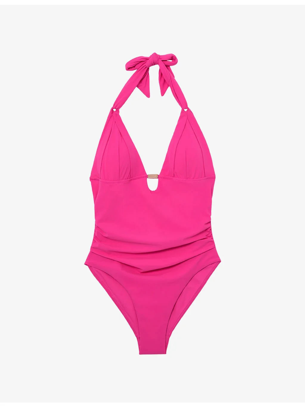 PRODUCT DETAILS - Reiss swimsuit - 74% nylon, 26% elastane - Self-tie fastening - Halterneck straps, plunging V-neck, pleated triangle cups, removable padding, powermesh, ruching at waist, signature ring hardware, high-leg cut, moderate rear coverage - Hand wash - True to size - Model is 5ft 9in/1.75m and wears a size UK 8 - Lightweight, stretchy Ref: R04527882