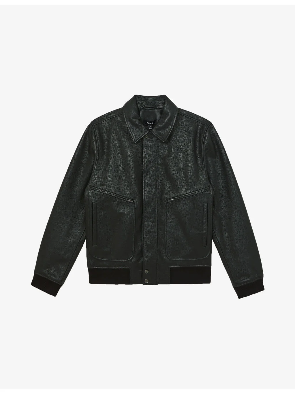 PRODUCT DETAILS - Reiss leather jacket - 100% leather; trim 95% polyester, 5% elastane - Concealed zip fastening - Regular fit, collar, long sleeves, all-over grained texture, two zipped pockets at front, two vertical welt pockets at front, ribbed trims to cuffs and hem - Specialist leather clean - Midweight, non-stretch Ref: R04482513