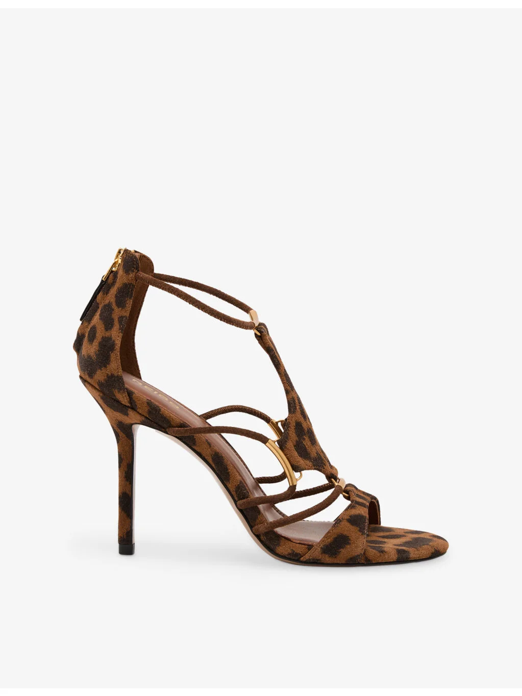 PRODUCT DETAILS - Reiss suede heeled sandals - 100% suede - Zip fastening - Almond toe, leopard print, strappy front, gold-toned bar hardware, stiletto heel - Heel height 3.9” - Specialist leather clean - Upper: 100% suede - Lining: 100% leather - Sole: 100% leather Ref: R04532114