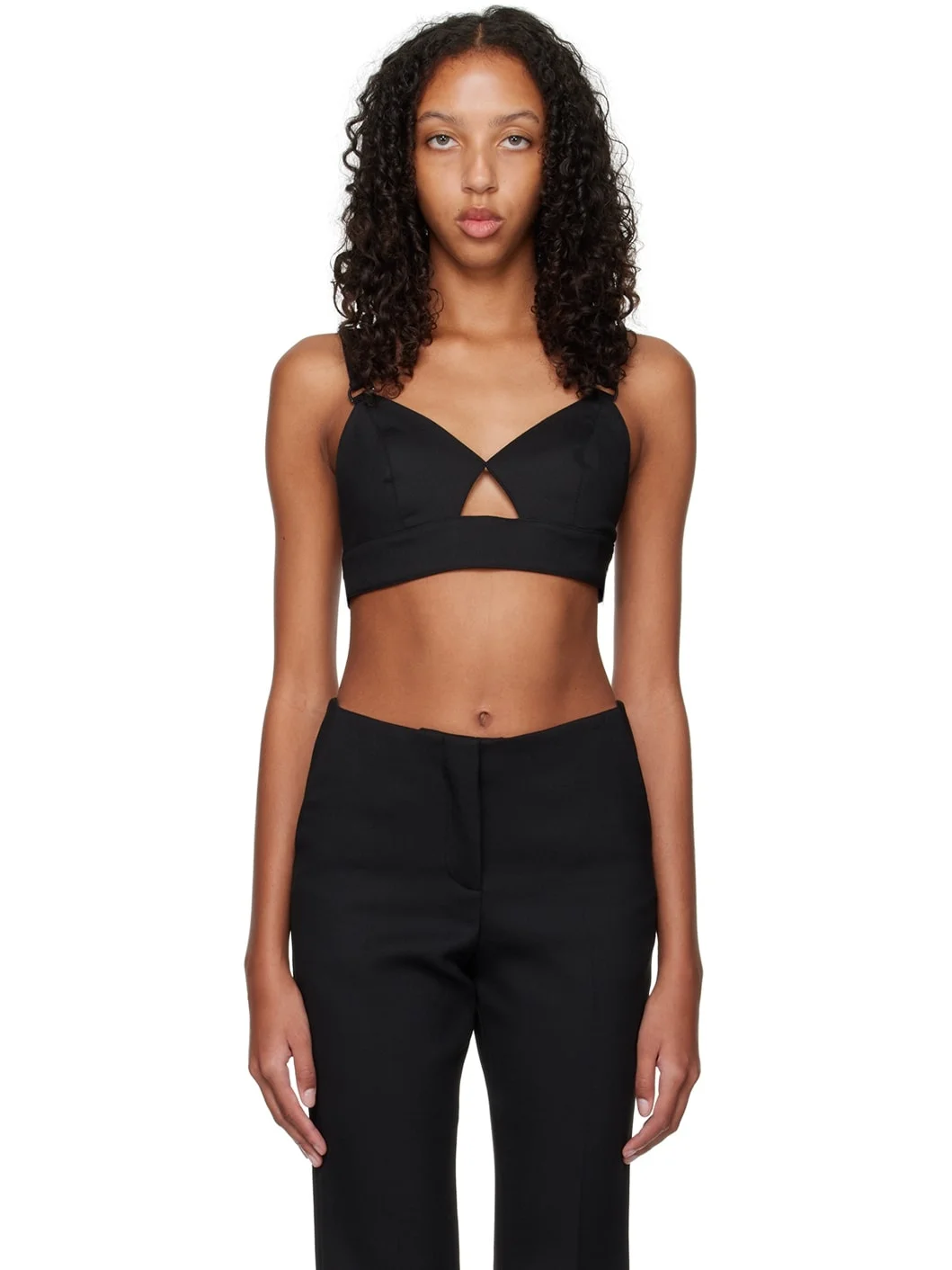 Stretch recycled polyester-blend twill bra. · V-neck · Cutout at front · Adjustable shoulder straps · Adjustable hook-eye fastening at back · Rubberized logo patch at back · Full logo-woven satin lining Supplier color: Black Body: 64% recycled polyester, 34% viscose, 2% elastane. Lining: 100% polyester. Made in Romania 231985F073001