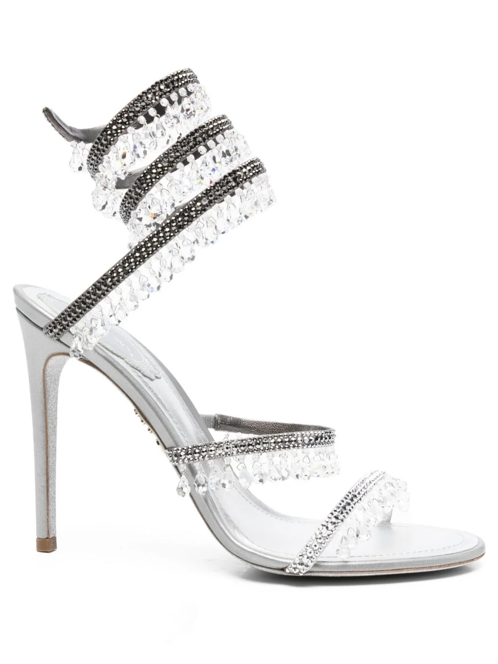 105mm crystal-embellished spiral sandals Highlights - Silver - Crystal embellishments - Spiral ankle wrap - Stiletto heel - Open toe Made in Italy Composition Outer: glass 100% Sole: Calf Leather 100%, Glitter 100% Lining: Calf Leather 100% SIZE & FIT Measurement HEEL 4.13 in(10.5 cm)