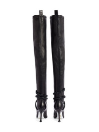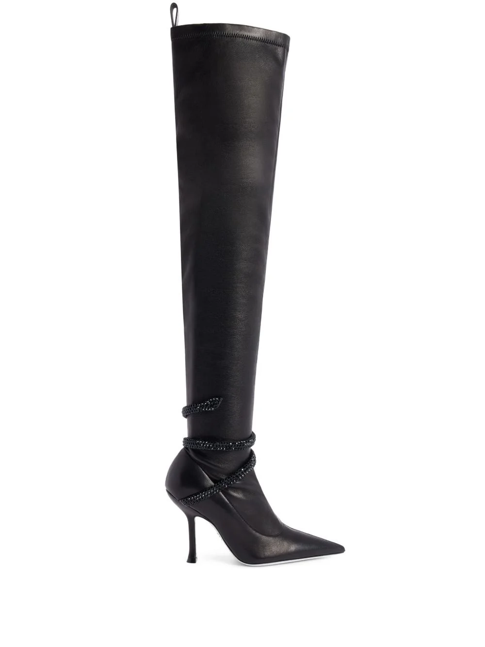 105mm Juniper boots Highlights - Black - Leather - Smooth grain - Slip-on style - 105mm sculpted heel - Pull-tab at the heel - Metallic snake detail - Crystal embellishment - Pointed toe - Branded leather insole - Leather sole Made in Italy Composition Sole: Leather 100%, Glitter 100% Lining: Leather 100% Outer: Leather 100%