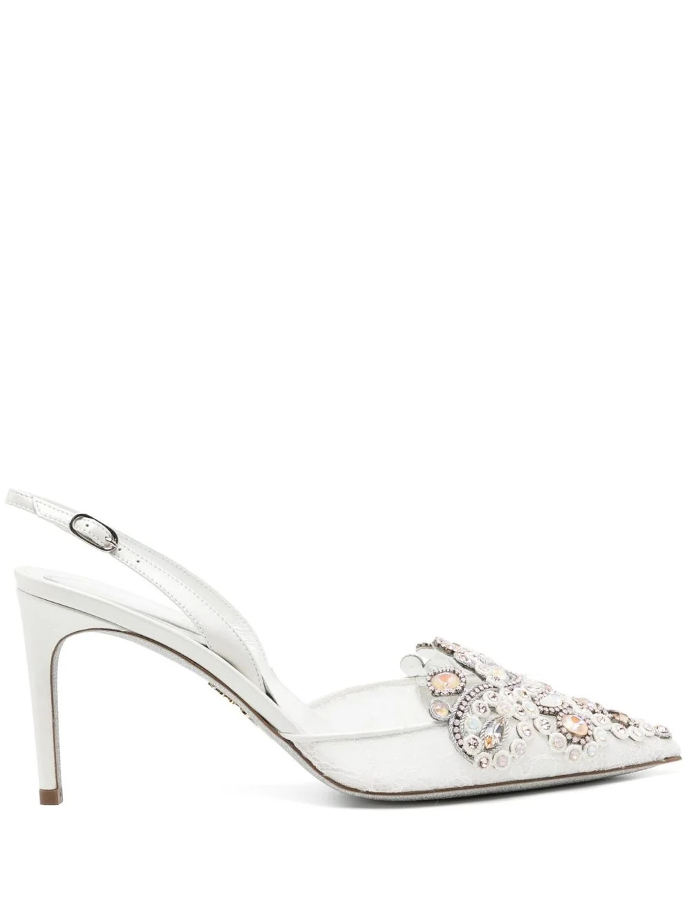 90mm Veneziana pumps Highlights - Cream white - Leather - Crystal embellishment - Buckle-fastening slingback strap - Pointed toe - Lace overlay - High stiletto heel - Branded leather insole - Glitter detailed leather sole Made in Italy Composition Lining: Leather 100% Outer: Other fibres 100% Sole: Leather 100% SIZE & FIT Measurement HEEL 3.54 in(9 cm) HEIGHT 1.18 in(3 cm) Sole height 0.03 in(0.1 cm)