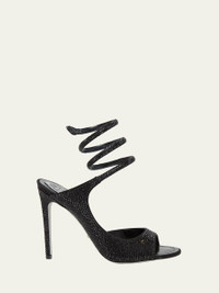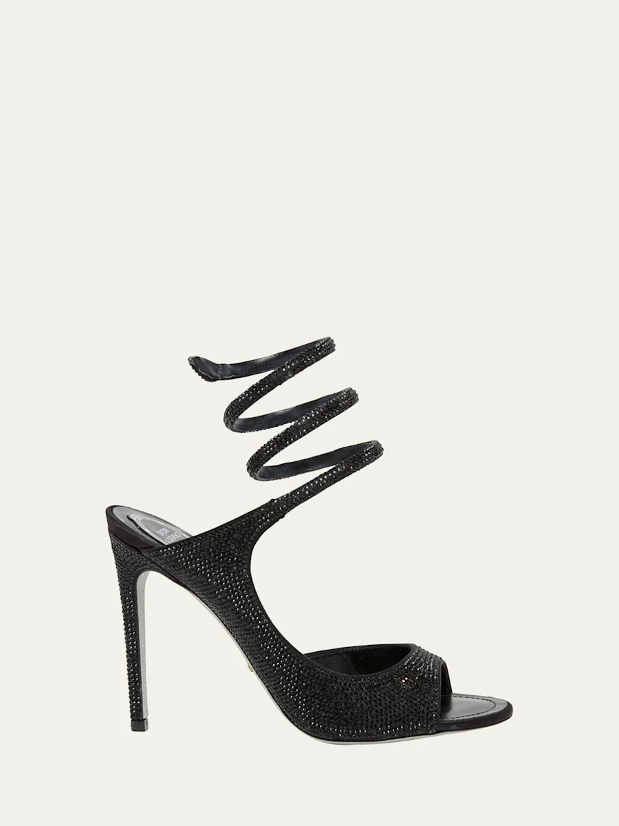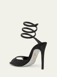 Crafted from silk, these strappy sandals by Rene Caovilla are embellished with tonal crystal strass 4.25 in / 105 mm stiletto heel Open toe Slipon style Signature spiral snakewrap ankle strap Rene Caovilla signature glitter outsole Made in Italy