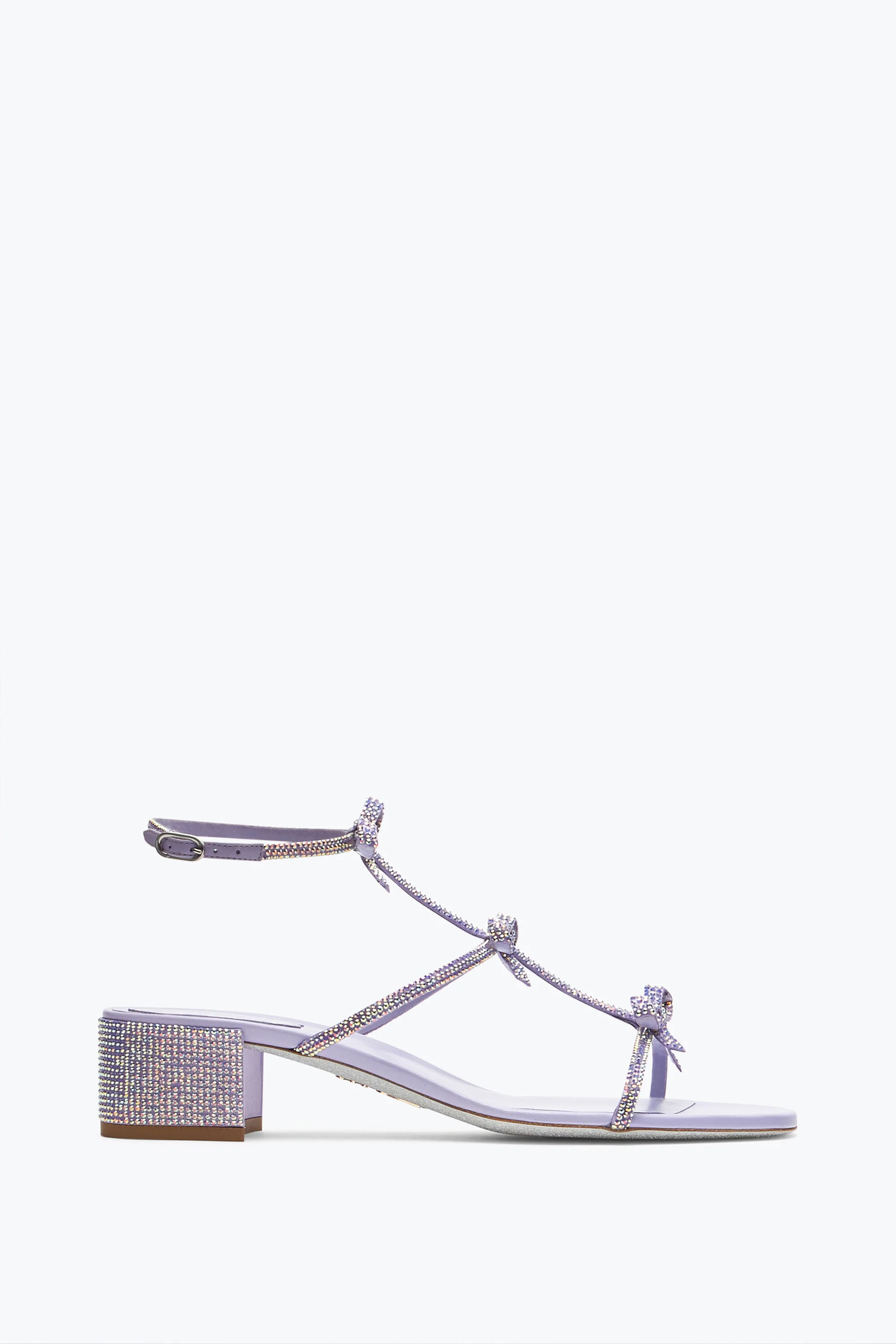 With this delicate lilac shade, the Caterina sandal accentuates its feminine and romantic side. The three classic tone-on-tone crystal-studded bows inspire optimism and joy, giving monochromatic looks that extra touch of color. - Satin - Hand-applied rhinestones - Block heel height 1.3’’ - Round toe - Made in Italy Ref. C11722-035-R001V543