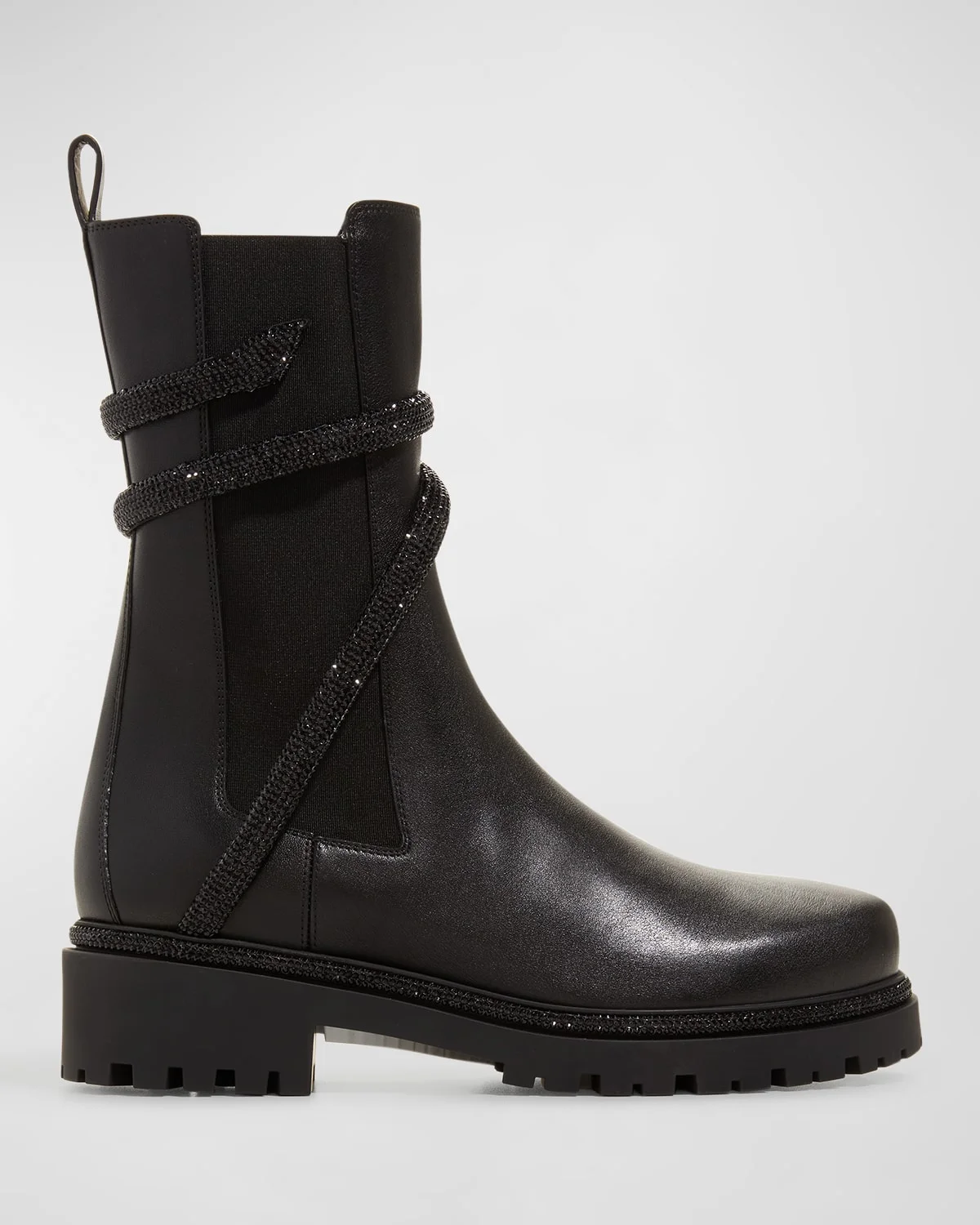 Rene Caovilla Chelsea moto boots in smooth calf leather with crystal strass wraparound straps 1" stacked heel Round toe Gored sides Pullon style Pulltab at back collar Lining: Leather/suede Lugged rubber sole Made in Italy
