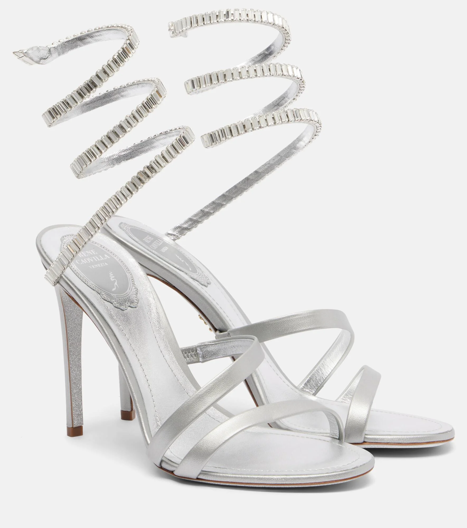You’ll find myriad reasons to slip on a shimmering Rene Caovilla design well beyond cocktail hour. Italian-crafted from metallic leather, the Cleo Spark sandals are set on 105mm stiletto heels and feature sparkling crystal-embellishments. Product Details - Upper: lamb leather - Lining: leather - Sole: leather insole and sole - Toe shape: round open toe - Made in Italy - Includes: shoe box, dust bag - Designer color name: Silver/Crystal Strass - Item color: silver - Closure: ankle strap - Item number: P01100786 Size & Fit - True to size - Slightly narrow calf - European sizes - 10,5cm-4" heel (size EU 38)