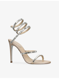 PRODUCT DETAILS - Rene Caovilla satin heeled sandals - 100% satin - Round toe, serpent hardware, baguette-cut rhinestone embellishments, branded footbed, stiletto heel - Heel height 105mm / 4.1 inches - Wipe with a clean, dry cloth - Made in Italy - Upper: 100% satin - Lining: 100% leather - Sole: 100% synthetic Ref: R04528123