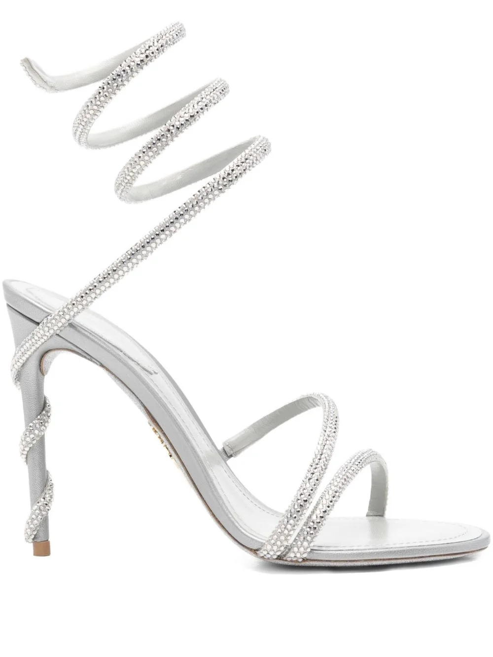 105mm Margot sandals Highlights - Grey - Satin fabric - Crystal-embellished snake ankle wrap - Crystal-embellished stiletto heel - Thin straps - Open toe Made in Italy Composition Outer: Fabric 100%, glass 100%, Calf Leather 100% Lining: Calf Leather 100% Sole: Glitter 100%, Rubber 100% SIZE & FIT Measurement HEEL 4.52 in(11.5 cm)