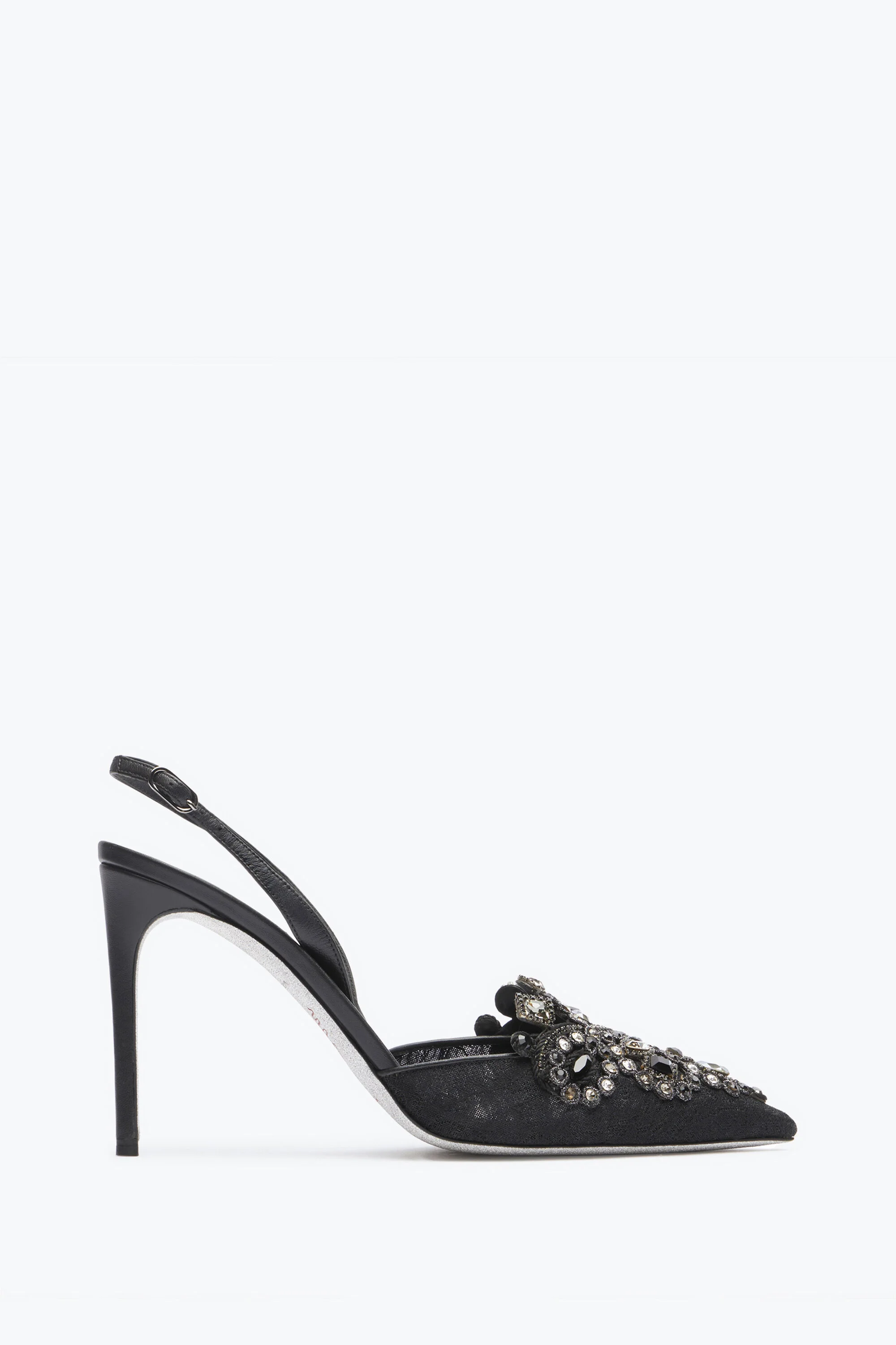 The black slingbacks VENEZIANA are a model that merges vintage style with an exclusive Made in Italy design. The pointed slingbacks with a heel are made of lace and have a leather heel strap with an adjustable buckle on the side. The model is decorated with stones and rhinestones that draw a highly refined motif. These slingbacks in lace are perfect for creating an elegant and refined look that does not go unnoticed. Ref. C10883-100-PN01V050