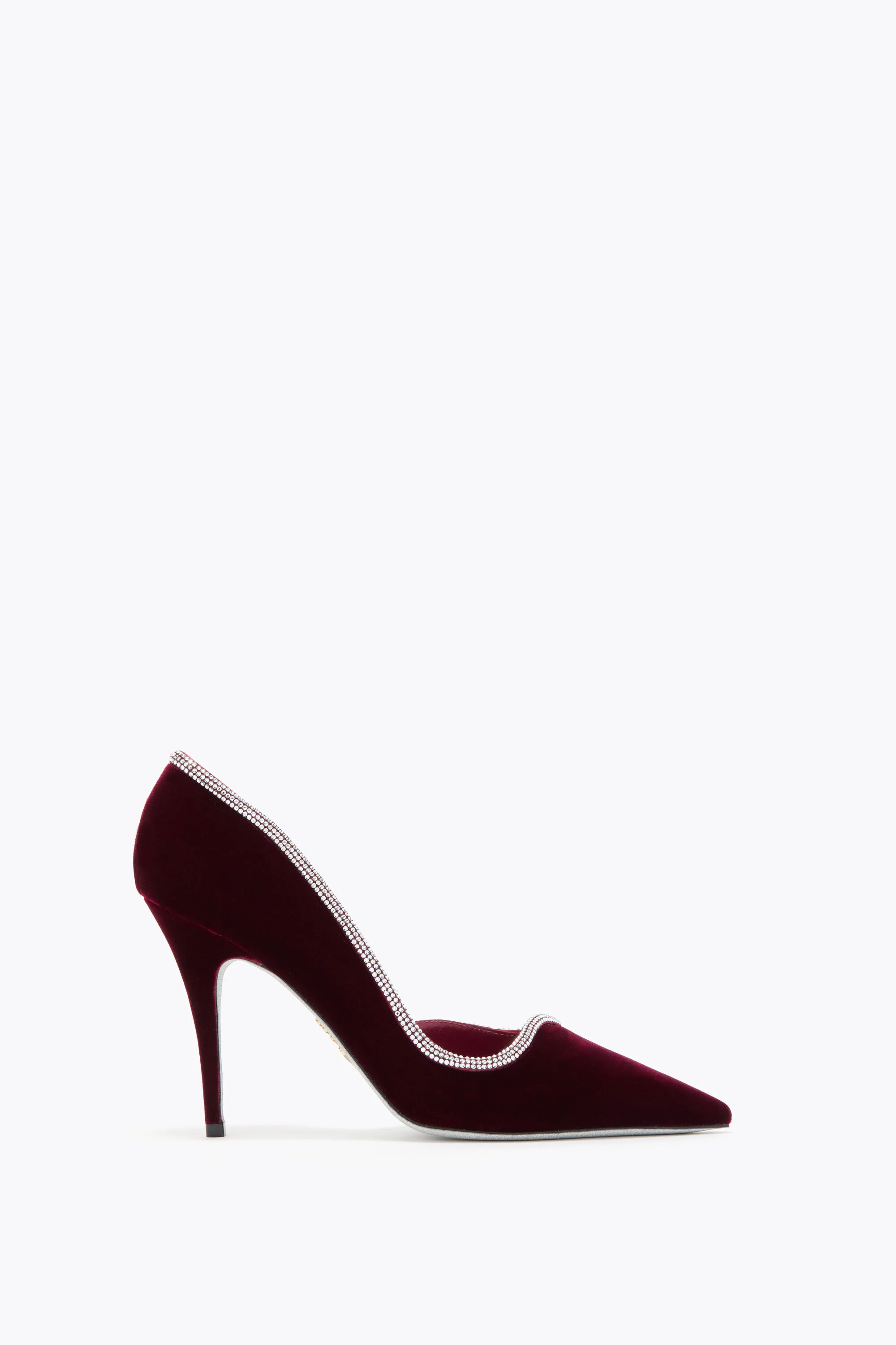 In the new Onda pump, a pointed silhouette is accentuated by wavy crystal-embellished trim and a 4-inch heel, creating a flattering and sophisticated effect. The burgundy velvet adds an extra layer of luxury. - Velvet - Hand-applied rhinestones - Stiletto heel height 4’’ - Pointed toe - Stardust sole - Made in Italy Ref. C12548-100-VL013443