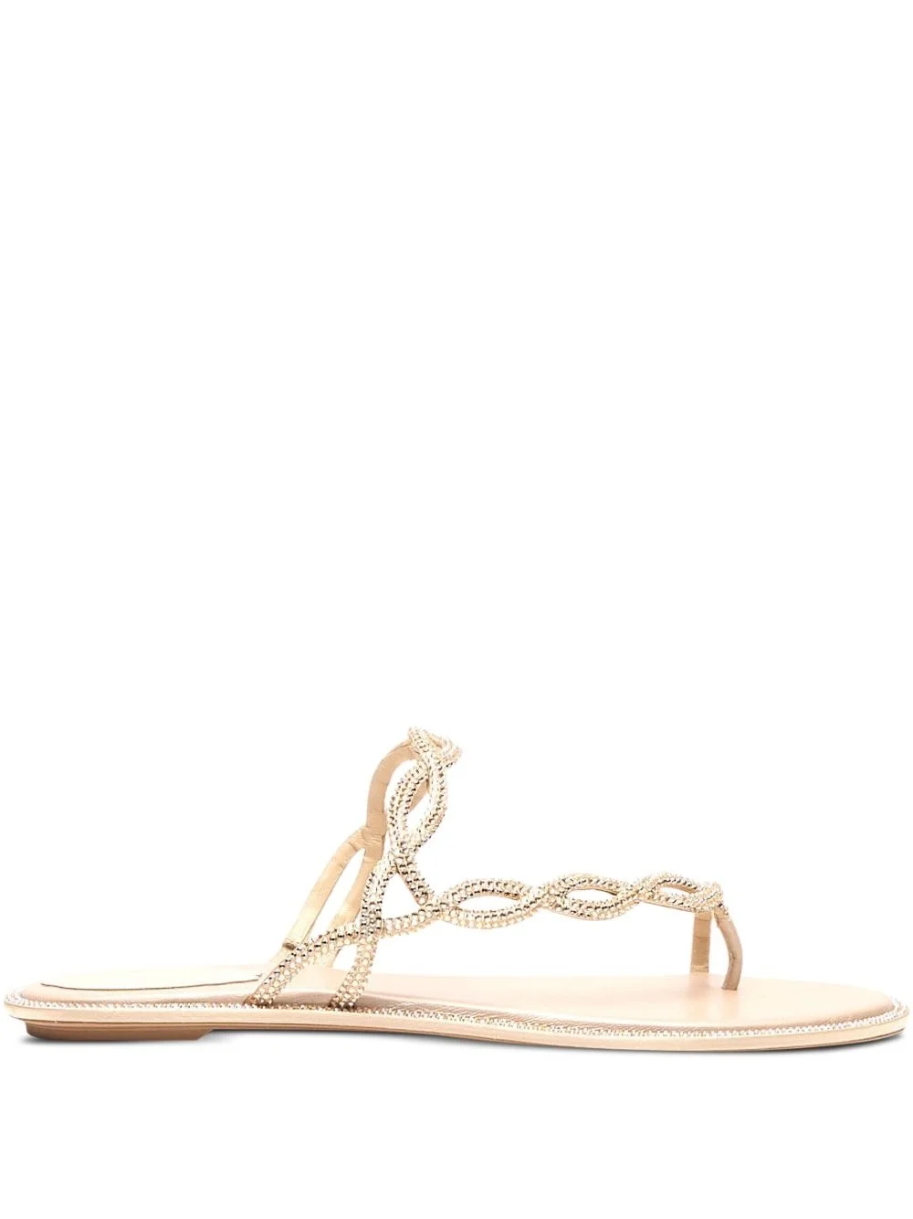 rhinestoned thong sandals Highlights - Beige - Intricate rhinestone detailing - Flat sole - T-bar design - Ankle strap Made in Italy Composition Outer: Satin 100% Lining: Satin 100%, Rubber 100%