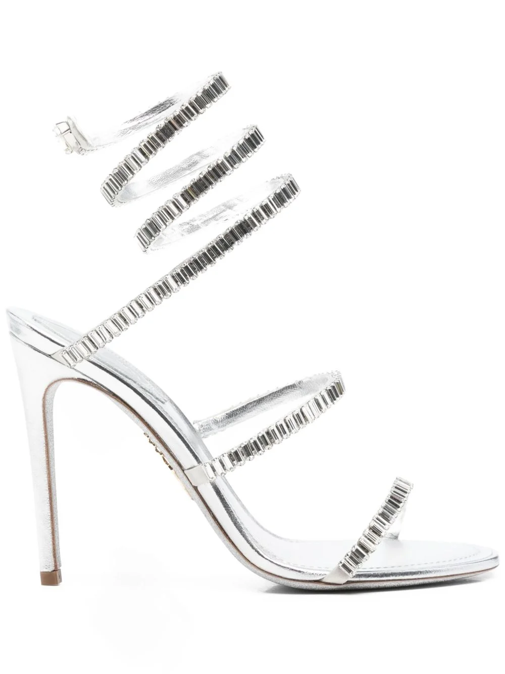105mm Cleo sandals Highlights - Silver-tone - Crystal embellishment - Stiletto heel - Open toe - Branded insole Made In Italy Composition Sole: glitter 100%, Calf Leather 100% Lining: Leather 100% Outer: Rhinestone 100% SIZE & FIT Measurement HEEL 4.13 in(10.5 cm)