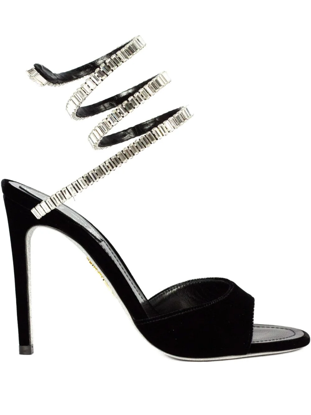 105mm Cleo Spark sandals Highlights - Black - Stiletto heel - Leather sole - Rhinestone embellishment - Open toe Made in Italy Composition Outer: Velvet 100%, Rhinestone 100% Lining: Calf Leather 100% Sole: Calf Leather 100% SIZE & FIT Measurement HEEL 4.09 in(10.4 cm)