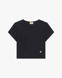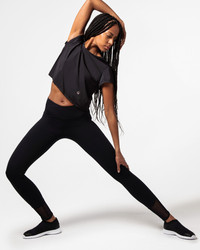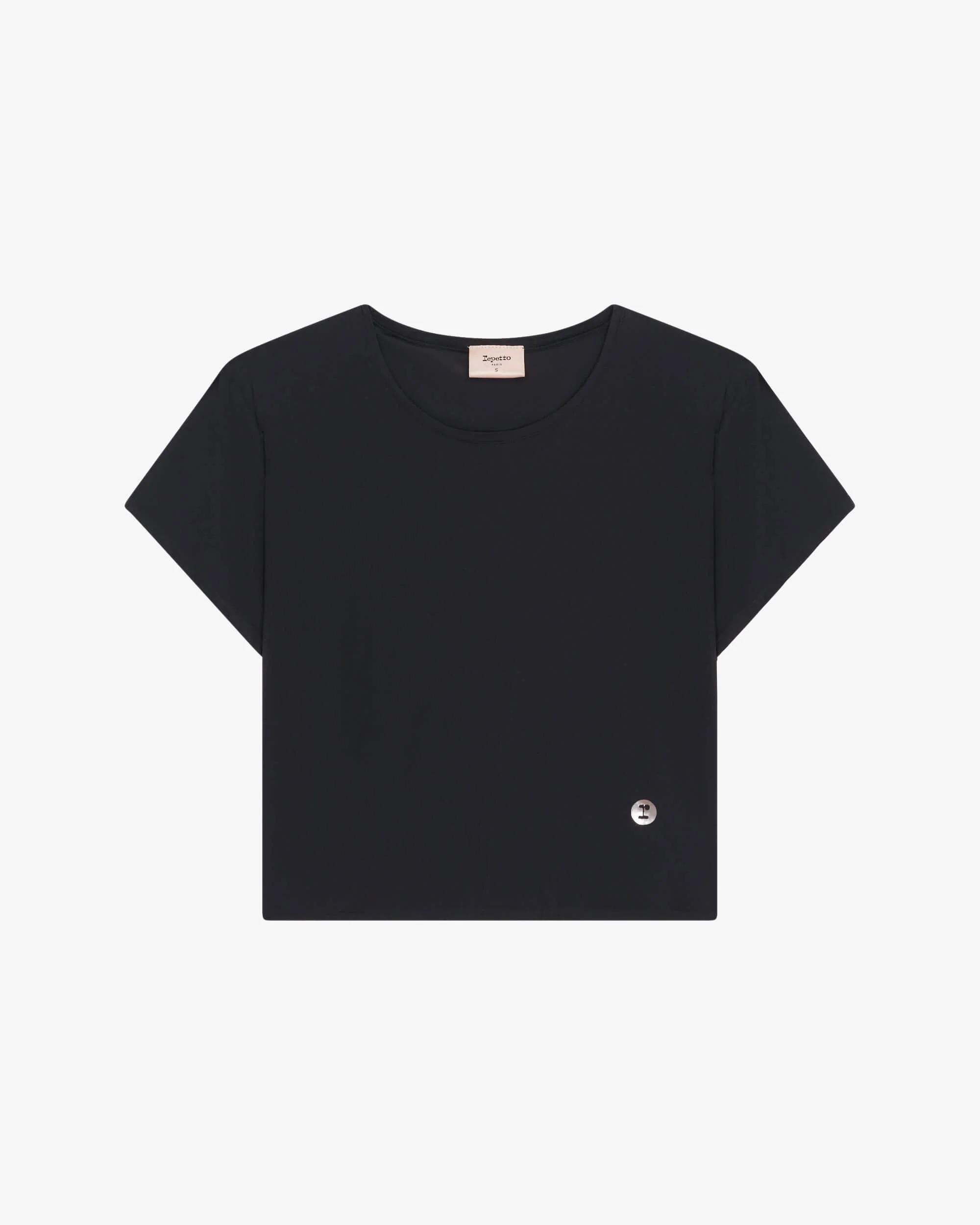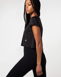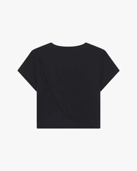 Designed in a lightweight and silky-like fabric, this crop-top can be worn over a bra for practice. It can also be matched with a classic pant for effortless, everyday wear. Inspired from the ballet world, the wrap-over style at the back gives a feminine and modern look. Round neck Short sleeves Wrap over-style at the backMaterial:Maille Active Silk Composition:76% Polyamide - 24% Elastane Color:Black Original country:Tunisia Ref: S0589-410-XS Product details Short sleeves. Crossed back. R circle logo transfer with pearl effect.