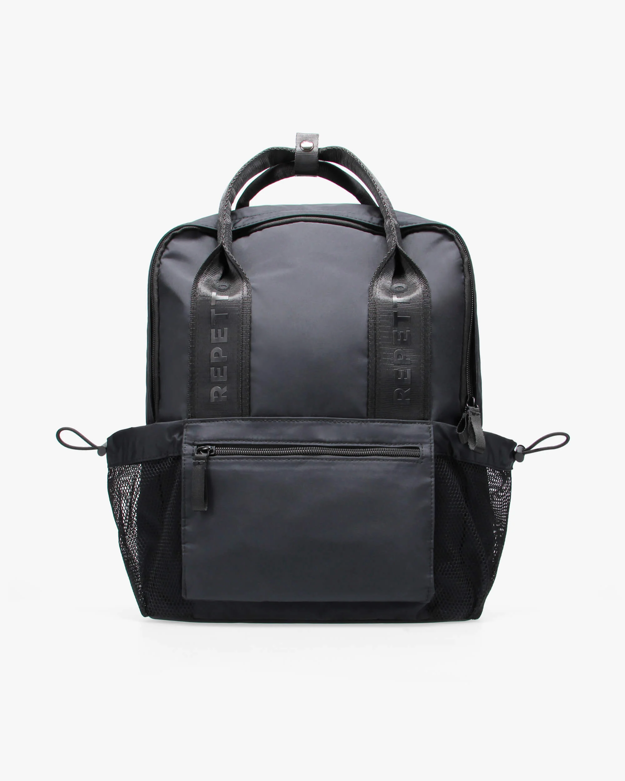 The large size of this nylon backpack is ideal for carrying all your belongings, featuring a small zippered front pocket for easy access to small accessories and two side pouches. Additionally, this backpack includes a compartment for your laptop, perfect for secure and organized transport. Its modern and functional design makes it the perfect accessory. Material: Nylon Color: Black Dimensions: Height 35 cm x Width 27 cm x Depth 10 cm Carried: Back Details: • Adjustable back straps • Zipper closure • Water-repellent nylon • REPETTO logo on straps • Two mesh outside pockets • Zipped front pocket Nylon lining. Ref: B0379N-410