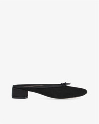 Repetto revisits its great successes by transforming its ballerina into a mule version with a small heel. Inimitable suppleness, signature lace and grosgrain trim place this new model in the great tradition of Repetto's iconic designs. Made in France, using the stitch-and-return artisanal know-how, mules Camille combines unique comfort with the elegance of liberated femininity.Material: Goatskin suedeColor: BlackHeels height: 3 cmOriginal country: FranceDetails: Cowhide leather insole. Cotton lining. Stitch-and-return. Leather sole.Benefits of the selected manufacturing process: Stitch-and-return is the historical manufacturing process of Maison Repetto, developed by Madame Rose Repetto in 1947. The sole is sewn inside out before being turned inside out. This is an obvious way to create a flexible and emotional model. Ref: V4183CV-410-35 Product details Cowhide leather insole. Cotton lining. Stitch-and-return. Leather sole.