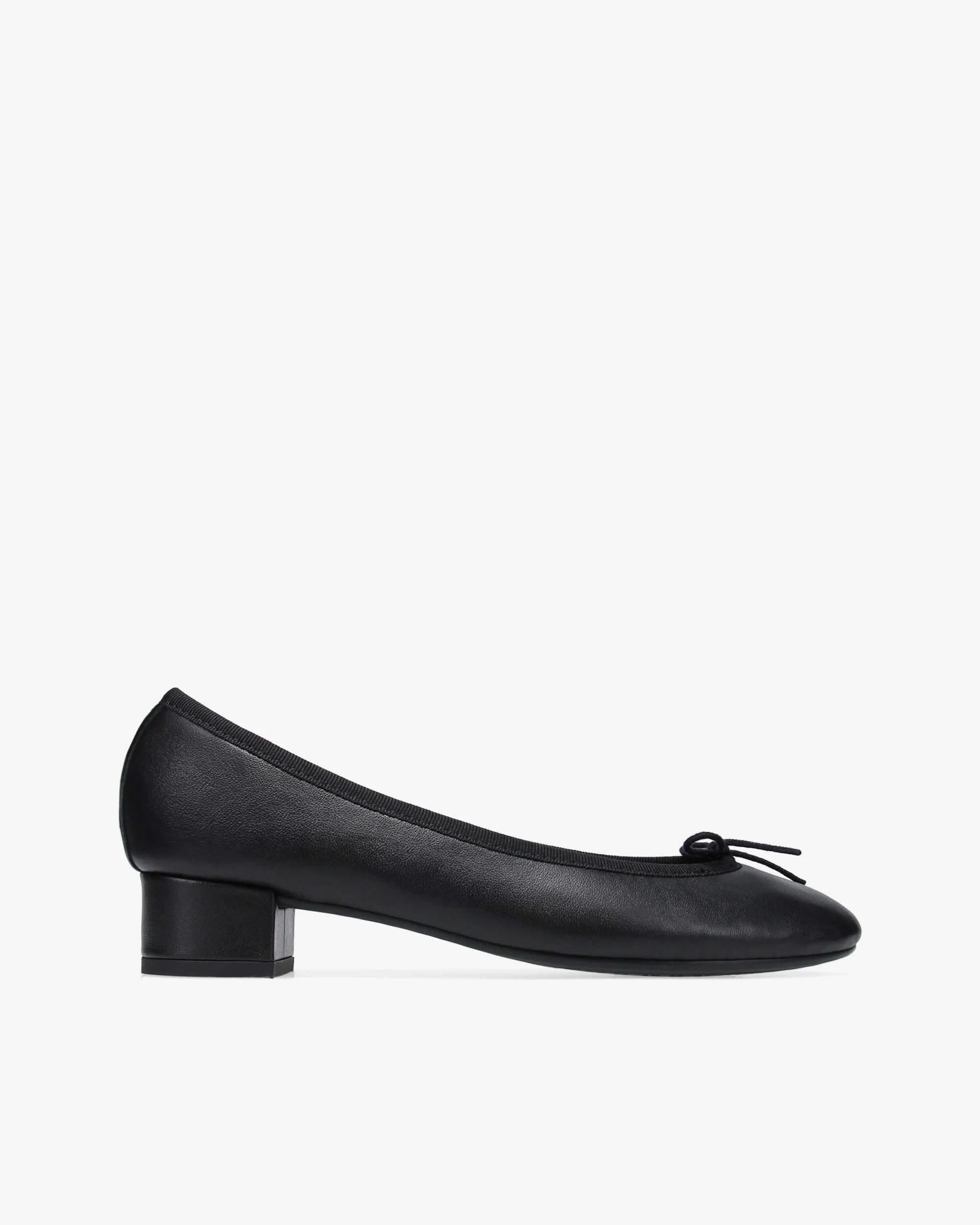 The Camille ballerina echoes the shape of the iconic Cendrillon, except this time it is set atop of a small heel. Although still just as comfortable and elegant, it will complete a classic look or be twisted with trendier pieces. Material: Nappa calfskin leather Color: Black Heels height: 3 cm Original country: France Details: Cowhide leather insole. Cotton lining. Leather wrapped heel. Stitch-and-return. Natural rubber sole (also available in leather sole). Benefits of the selected manufacturing process: Stitch-and-return is the historical manufacturing process of Maison Repetto, developed by Madame Rose Repetto in 1947. The sole is sewn inside out before being turned inside out. This is an obvious way to create a flexible and emotional model. Here, made with a rubber sole, it ensures comfort and optimal resistance. Ref: V080VE-410-34 Product details Cowhide leather insole. Cotton lining. Leather wrapped heel. Stitch-and-return. Natural rubber sole (also available in leather sole). Benefits of the selected manufacturing process: Stitch-and-return is the historical manufacturing process of Maison Repetto, developed by Madame Rose Repetto in 1947. The sole is sewn inside out before being turned inside out. This is an obvious way to create a flexible and emotional model. Here, made with a rubber sole, it ensures comfort and optimal resistance.