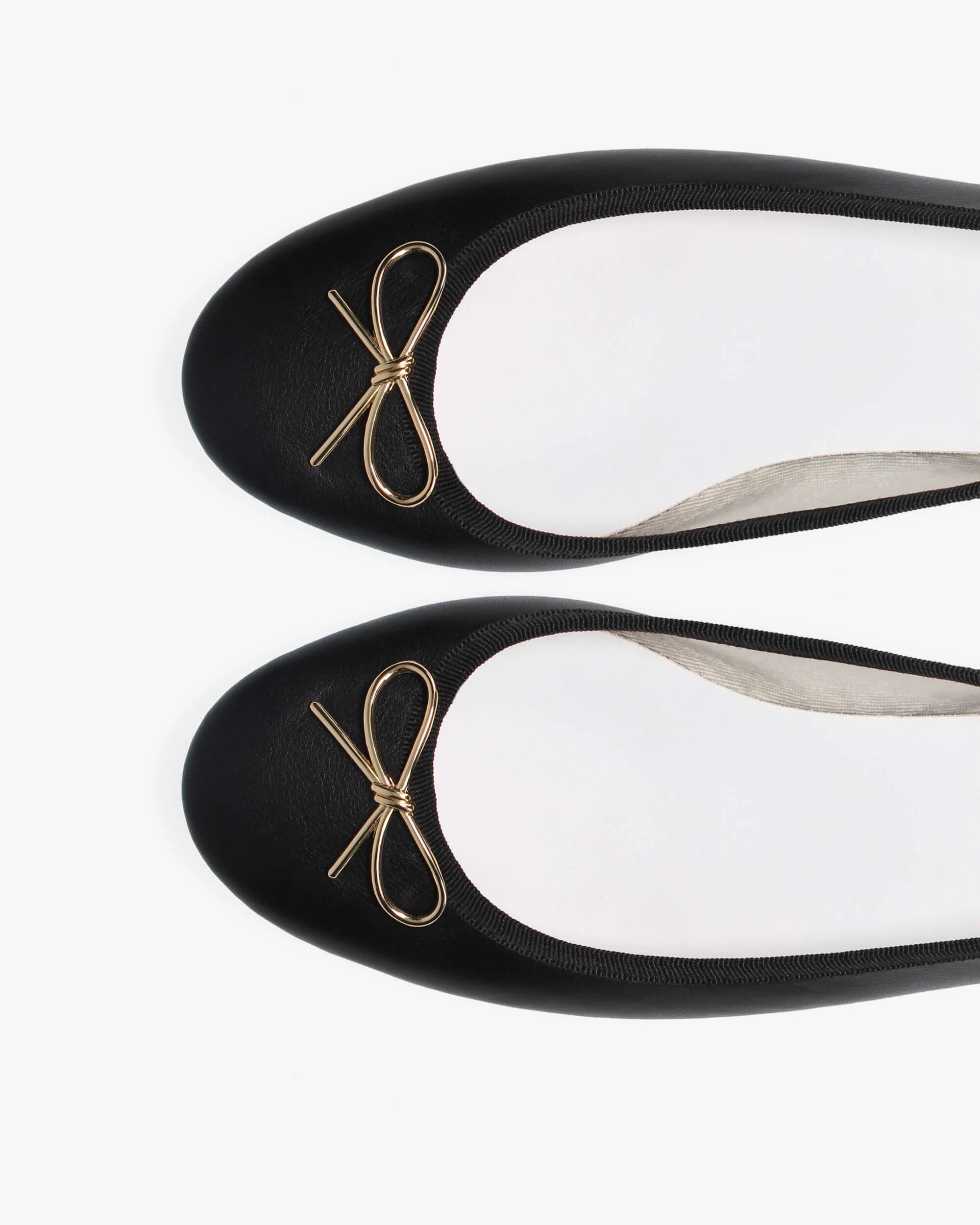 Repetto revisits its great successes by revisiting its ballerina into a golden metallic bow version. Inimitable suppleness and grosgrain trim place this new model in the great tradition of Repetto's iconic designs. Made in France, using the stitch-and-return artisanal know-how and featuring a resistant rubber sole, this style combines unique comfort with elegance. Material: Nappa calfskin Color: Black Heels height: 1 cm Original country: France Details: Cowhide leather insole. Cotton lining. Leather wrapped heel. Stitch-and-return. Natural rubber sole. Benefits of the selected manufacturing process: Stitch-and-return is the historical manufacturing process of Maison Repetto, developed by Madame Rose Repetto in 1947. The sole is sewn inside out before being turned inside out. This is an obvious way to create a flexible and emotional model. The rubber sole used on this model offers optimum resistance. Ref: V4201VE-410-35