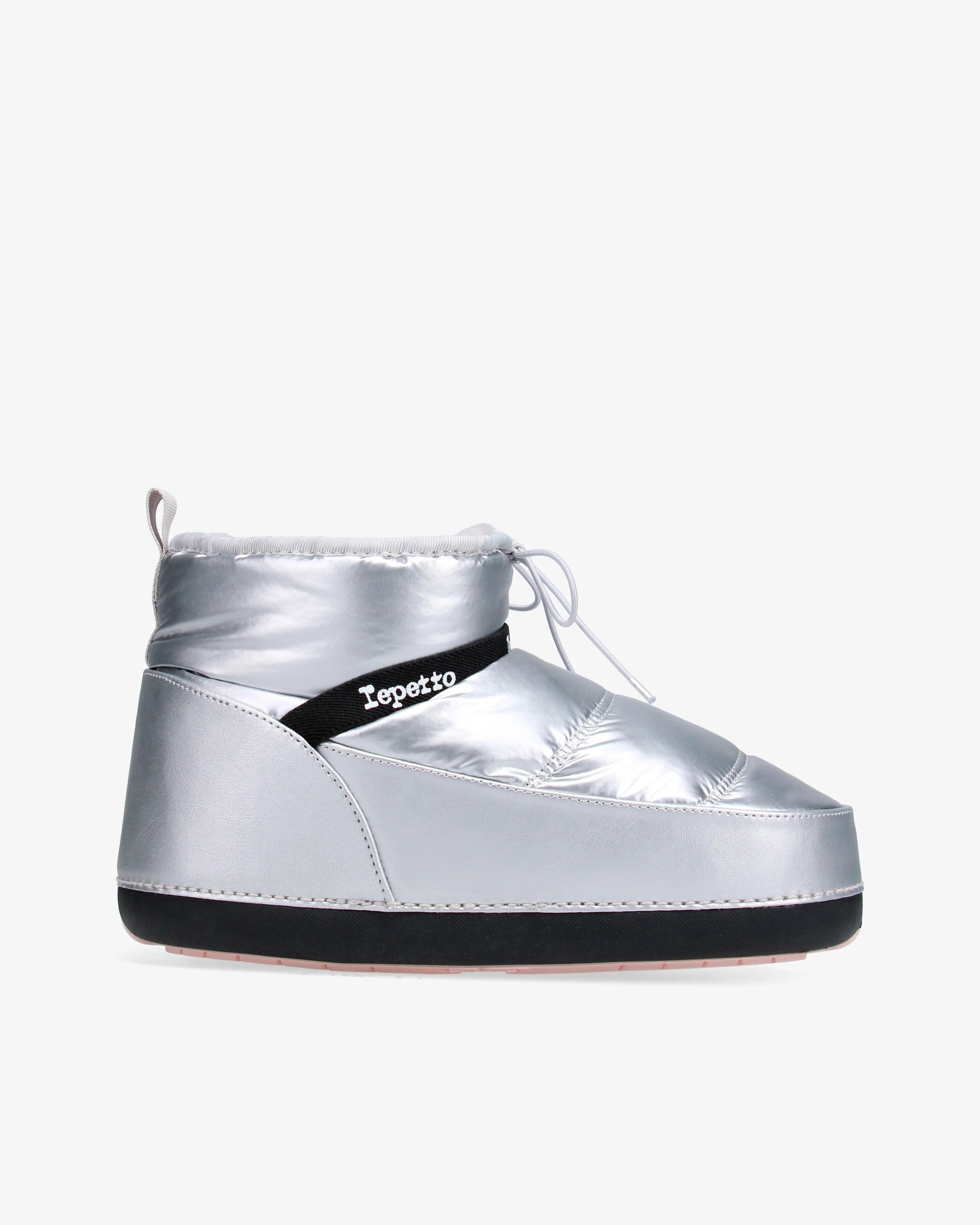 Repetto offers a mid-high version of its Gentiane boots, for a model that's easy to slip on, comfortable and suited to city life. Made with a solid rubber sole, water-repellant materials and highly comfortable fluffy inside lining, Gentiane Mid boots combine femininity, warmth and comfort. Material : Polyester Color : Silver Heels height: Without heel Country of origin: China Details: Polyester Insole and lining. No heel. Polyurethane sole. Ref: V4219TTCH-020-S Product details Polyester Insole and lining. No heel. Polyurethane sole.